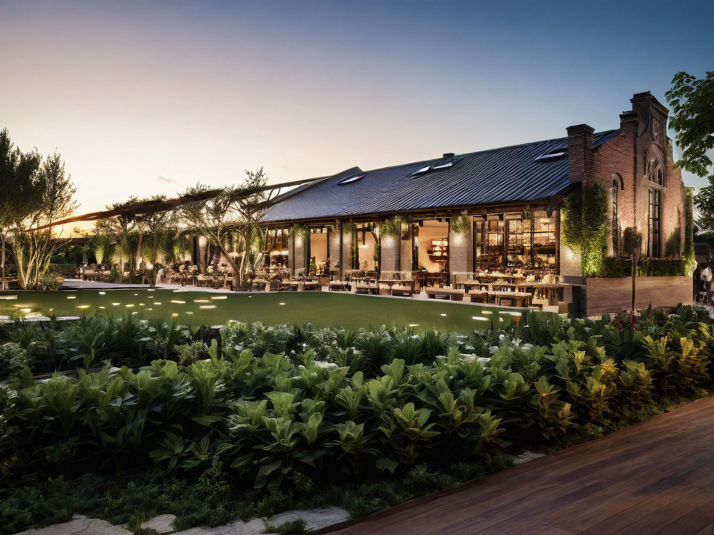 Promptfood hall, garden, same construction materials, same facade style, amazing terrace
