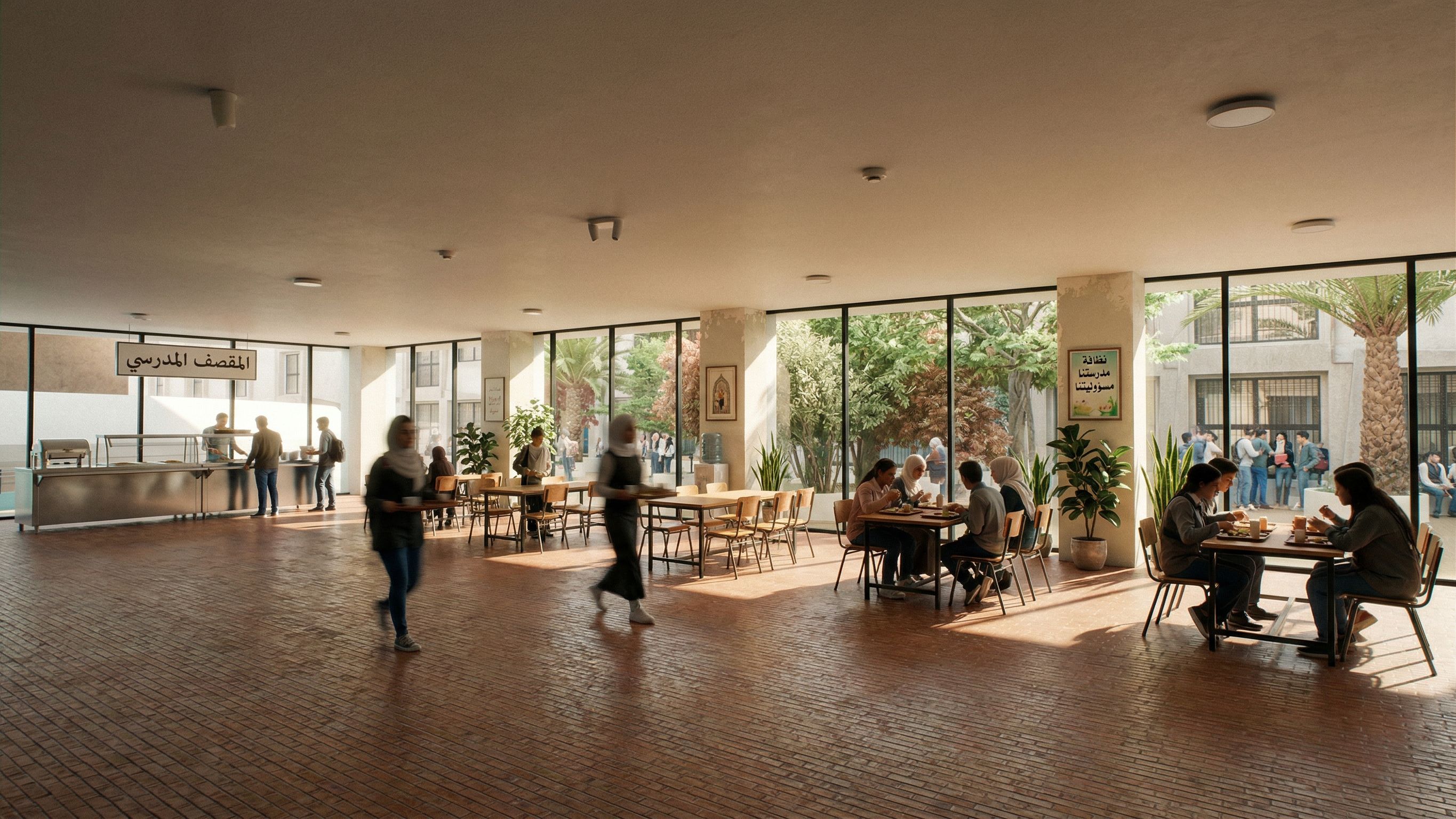 this is the interior of a cafeteria of a syrian arab school where highschool students relax and eat their lunch and interact . do simple interior design for school buffet, keep exact camera angle