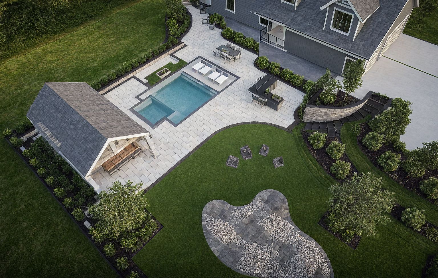 Make this photorealistic, house with gray siding, putt-putt range