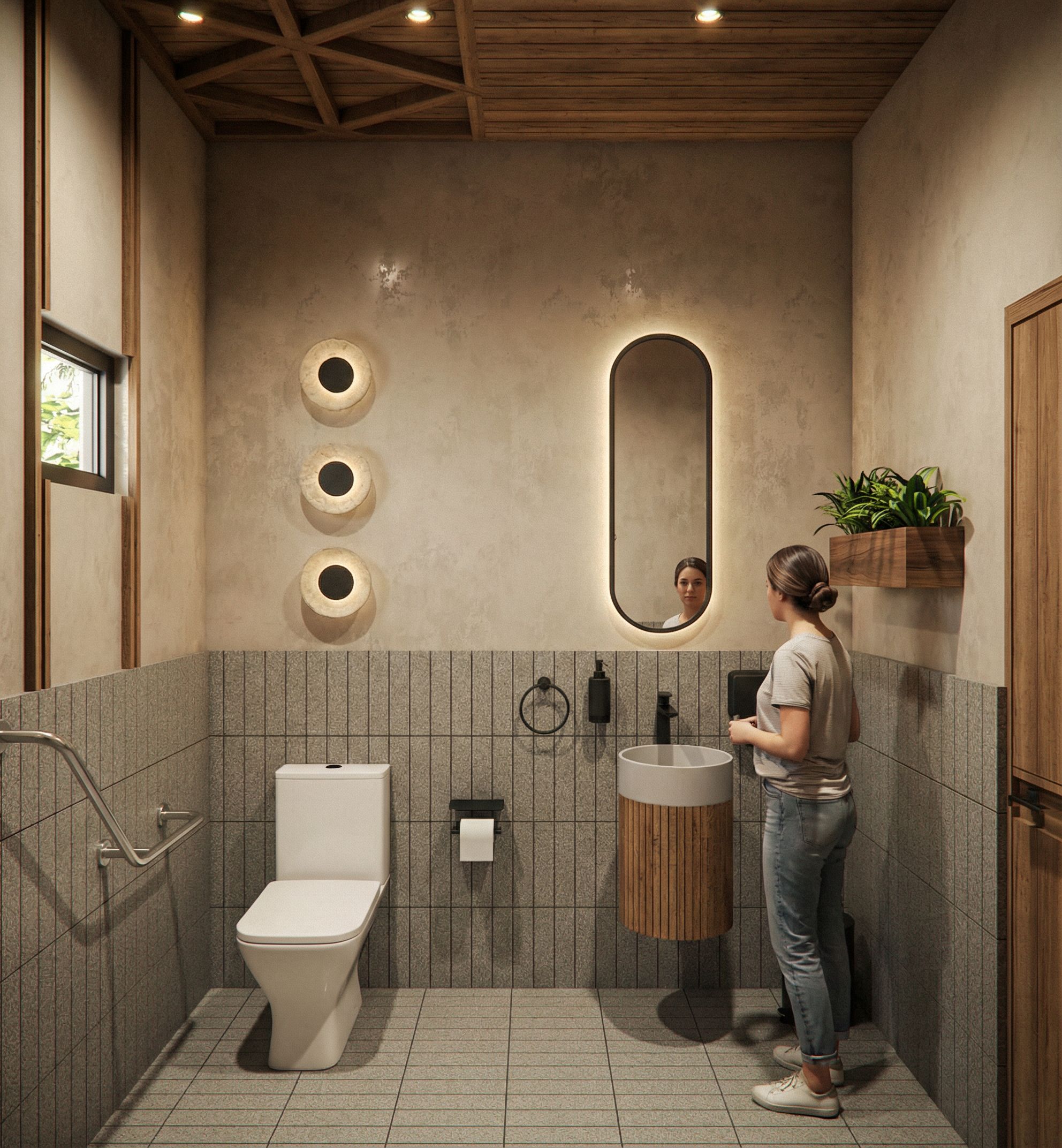 Photorealistic rendering of a public restroom located in Plaza Paseo Rocaval, in San Cristóbal de las Casas, Chiapas.Organic, natural, and contemporary style, with a warm, realistic, and slightly theatrical atmosphere.The existing restroom layout must be fully respected.Materials and finishes: 7 x 30 cm ceramic tile flooring with a medium gray granite-look finish, also used on walls and wainscoting up to 1.20 m high, with a 3 mm visible grout joint. Upper walls finished with a chukum-type paste in a natural tone with a smooth, handcrafted texture.Sink and Vanity. Vanity in WALNUT wood with vertical grooves. Ceramic sink in a natural concrete-gray finish. Mixer faucet in a matte black finish. Bathroom accessories in black. MirroR. Oval mirror with a black frame and soft perimeter backlighting.Toilet White ceramic toilet with a contemporary design. Graphic Element: Natural Elements only one Planter in walnut wood as it was in te photo. Vertical elements in walnut wood flanking the window as an architectural accent. Ceiling and Lighting: Ceiling in walnut wood, respecting the original shape of the space. Small square recessed spotlights in the ceiling. Wall lights above the toilet with a natural stone or marble finish. Lighting: Warm, stage-like lighting with soft shadows and enhanced textures. Emphasis on wood, chukum, floor tiles, and graphic elements. Realistic, clean, and sophisticated atmosphere., keep exact camera angle,Remove the pictures, the girl, and the objects on the background paneling,remove flowerpots on floor. Respect the shape of the ceiling in the photo, as well as the location of the bathroom fixtures; remove the wood paneling below and above the window. remove the leaves that are visible on the mirror.remove the box on the right side,remove hanging planter under window,Remove the wooden box from under the window, place black bathroom accessories, and one person, keep exact camera angle