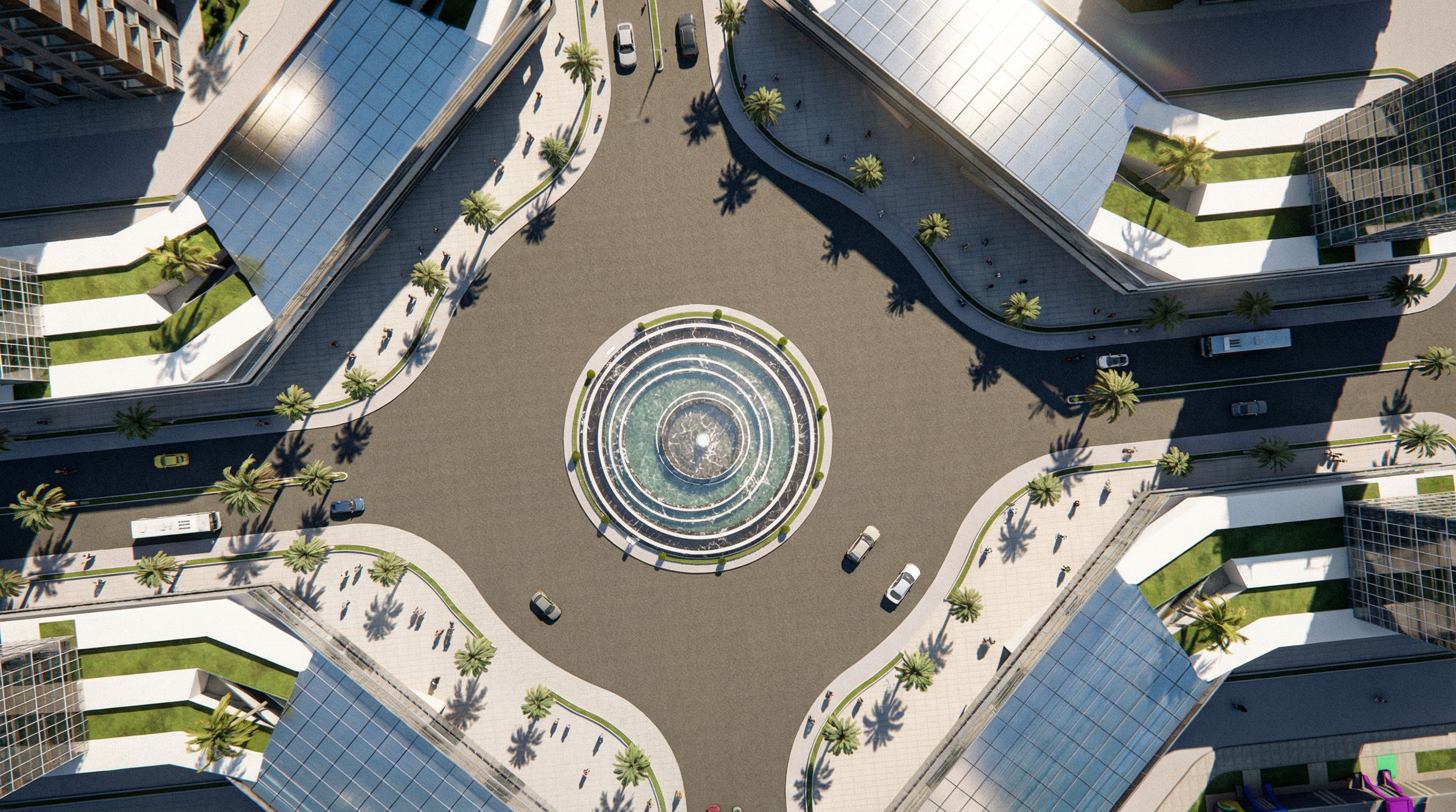 Photo of a modern urban intersection . Emphasize sleek architectural lines, large glass facades. Surrounding the roundabout are palm trees and well-maintained pavement. Bright daylight enhances the scene, casting intricate shadows and highlights. Capture a bird's-eye view for a wide perspective, showcasing the circular traffic design and surrounding structures, while using a standard lens for clarity and detail. , keep exact camera angle