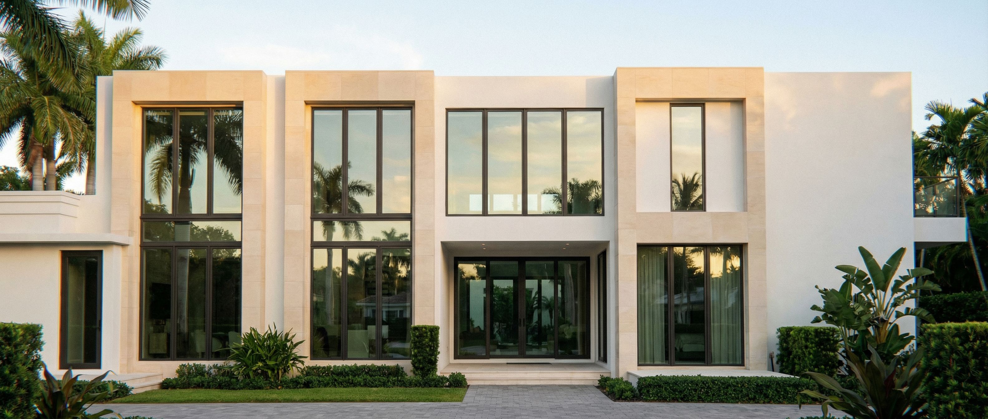 Photorealistic Perspective Rendering – Strict Elevation Execution Ultra photorealistic rendering of a Palm Beach modern Regency / Miami style house. This rendering must follow the provided elevation drawing exactly. CRITICAL RULES: The elevation defines ALL geometry and proportions. Do not redesign, reinterpret, or adjust anything. Do not change massing, spacing, or alignment. Do not move or resize windows or doors. Do not make the façade symmetrical. If the result does not match the elevation exactly, regenerate. FACADE AND MASSING: The façade is composed of distinct vertical bays. All bays must match the elevation exactly in width, height, and spacing. The façade is not flat. The central portion is recessed and forms a covered patio. This recessed zone must sit clearly behind the adjacent walls and be visibly deeper. Sliding glass doors within the recessed patio must be inset further back and appear in shadow. WINDOWS AND GLASS: All indicated areas are glass. Use large modern glazing with thin dark frames. The horizontal band between floors is spandrel glass. It is opaque not see-through but matches the look of the other glass. MATERIALS: Main building: smooth white stucco, clean matte finish. Vertical accent bays: light limestone panels. No visible joints, seams, or grid lines. Large smooth slabs with a refined warm tone. FORM: Two-story composition with strong vertical alignment. Upper and lower openings must align exactly. Maintain clean horizontal datums across the façade. CAMERA VIEW: elevation, not flat.. Eye level around 5–6 feet. Natural lens, no distortion. LIGHTING: Soft late afternoon light. Even illumination on façade. Subtle shadows to show depth. Realistic reflections in glass. STYLE: Elegant, minimal, high-end Palm Beach modern Regency. Photorealistic, not stylized., keep exact camera angle