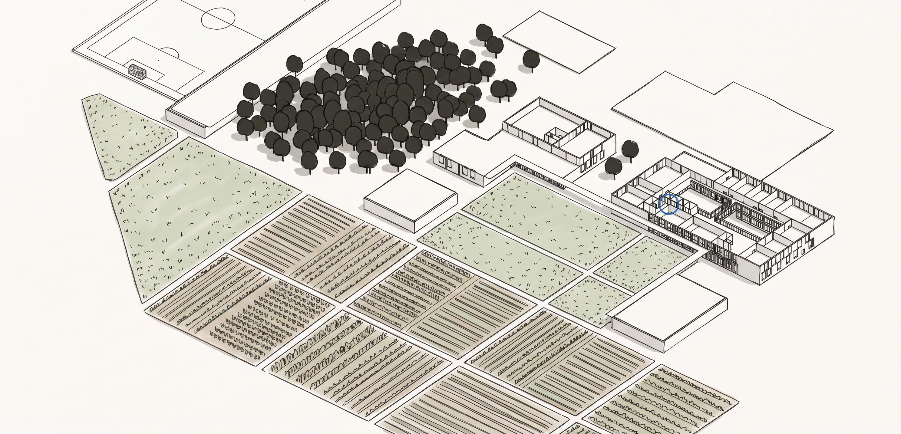 Isometric site plan drawn as if sketched on a graphic tablet. Conserve absolutely every element exactly as in the original. The first large rectangular plots represent agricultural test fields, the second series of plots represents green vegetation, and the cluster of trees represents a forest. Densify only the forest and render only the agricultural test plots, but apart from densifying the forest and making the agricultural parcels, do not add anything at all. Remove the blue grid in the background. Keep all buildings, paths, and the soccer field unchanged. Use clean digital linework with pressure‑sensitive strokes and a hand‑drawn tablet‑style finish, keep exact camera angle