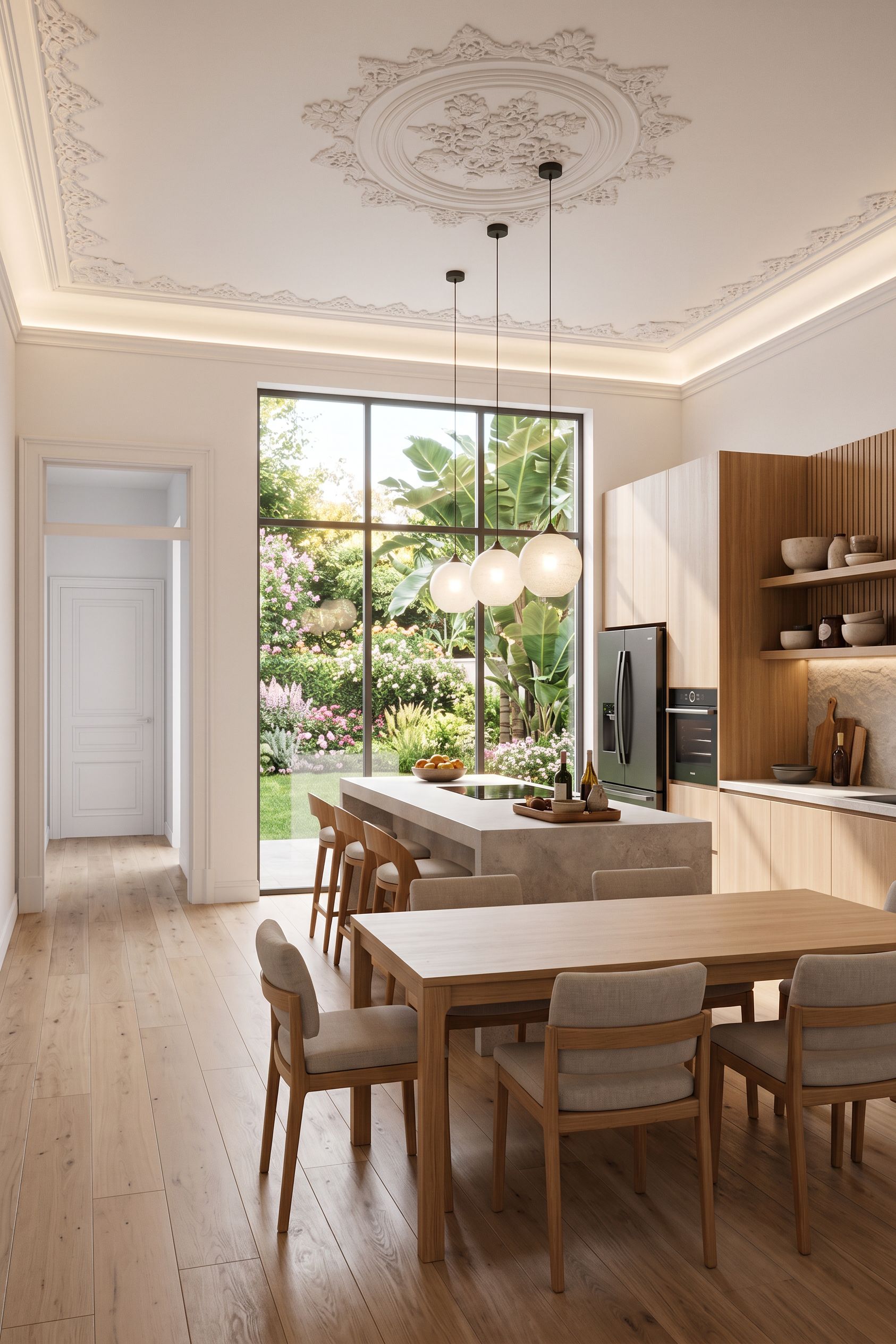 PromptRetirar todos os objectos existentes na foto e decorar a cozinha e sala de jantar conforme referência. colocar a cozinha na parede lateral direita, e pintar todas as paredes de branco retirar toda a parede frontal com porta de vidro no fundo para jardim. colocar chão de madeira conforme referência , keep exact camera angle