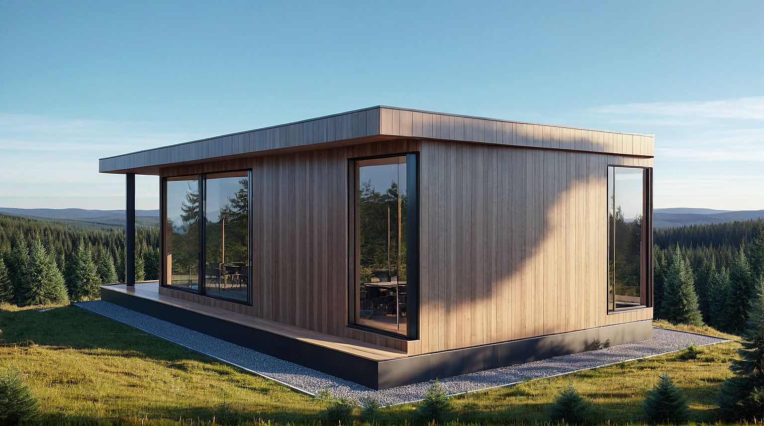 Promptmodern high-tech house with panoramic windows and with an outdoor terrace. Against the background of a coniferous forest.
