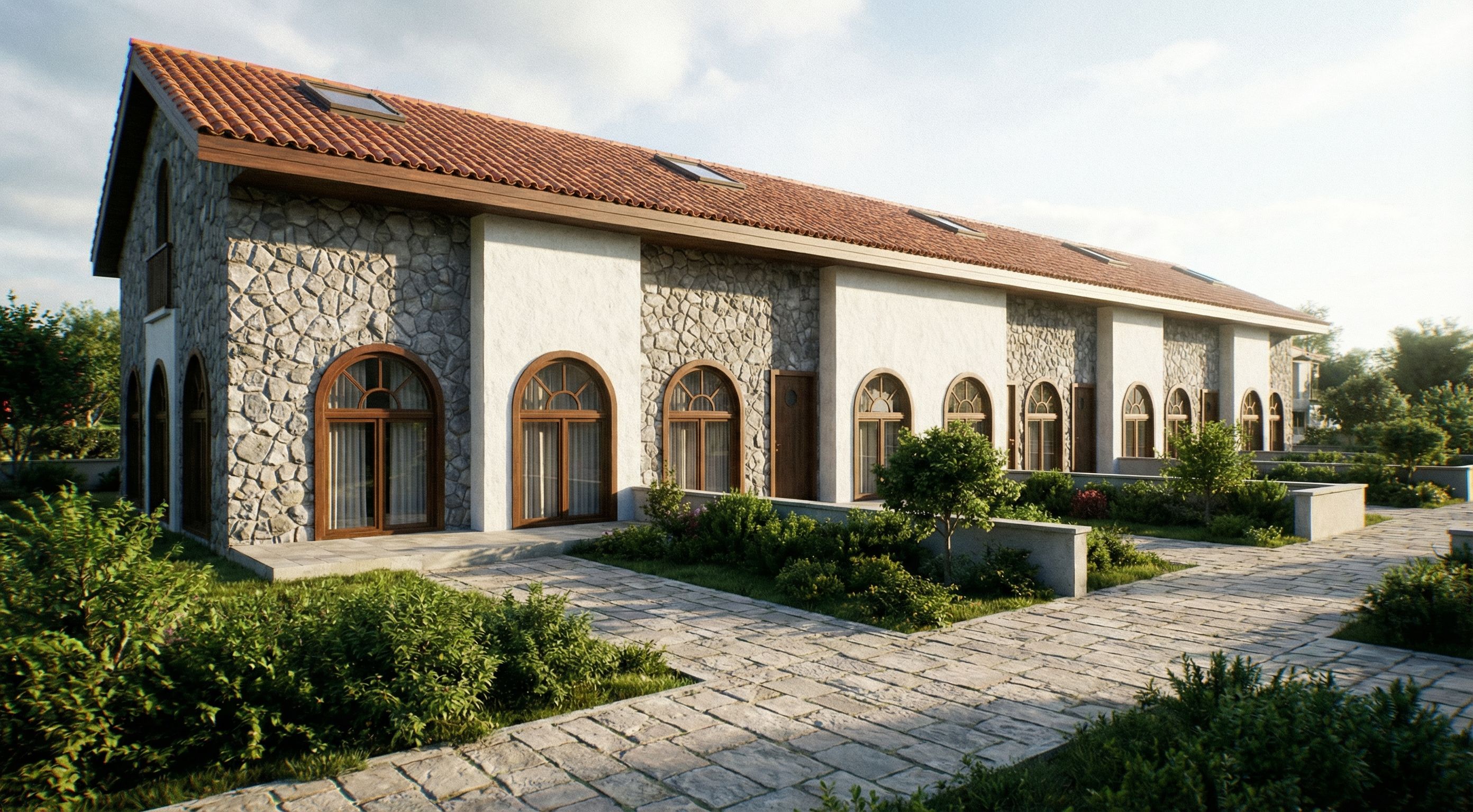 Photo of a residential building featuring stone and stucco facades with arched windows. The structure is nestled in a green landscape with paved pathways leading to the entrance. Morning sunlight casts soft shadows across the front yard, highlighting the textures of the materials. Shot from a low angle to emphasize the building's height and design details. A wide-angle lens captures the surrounding greenery and open space, enhancing the inviting atmosphere of the housing complex., keep exact camera angle