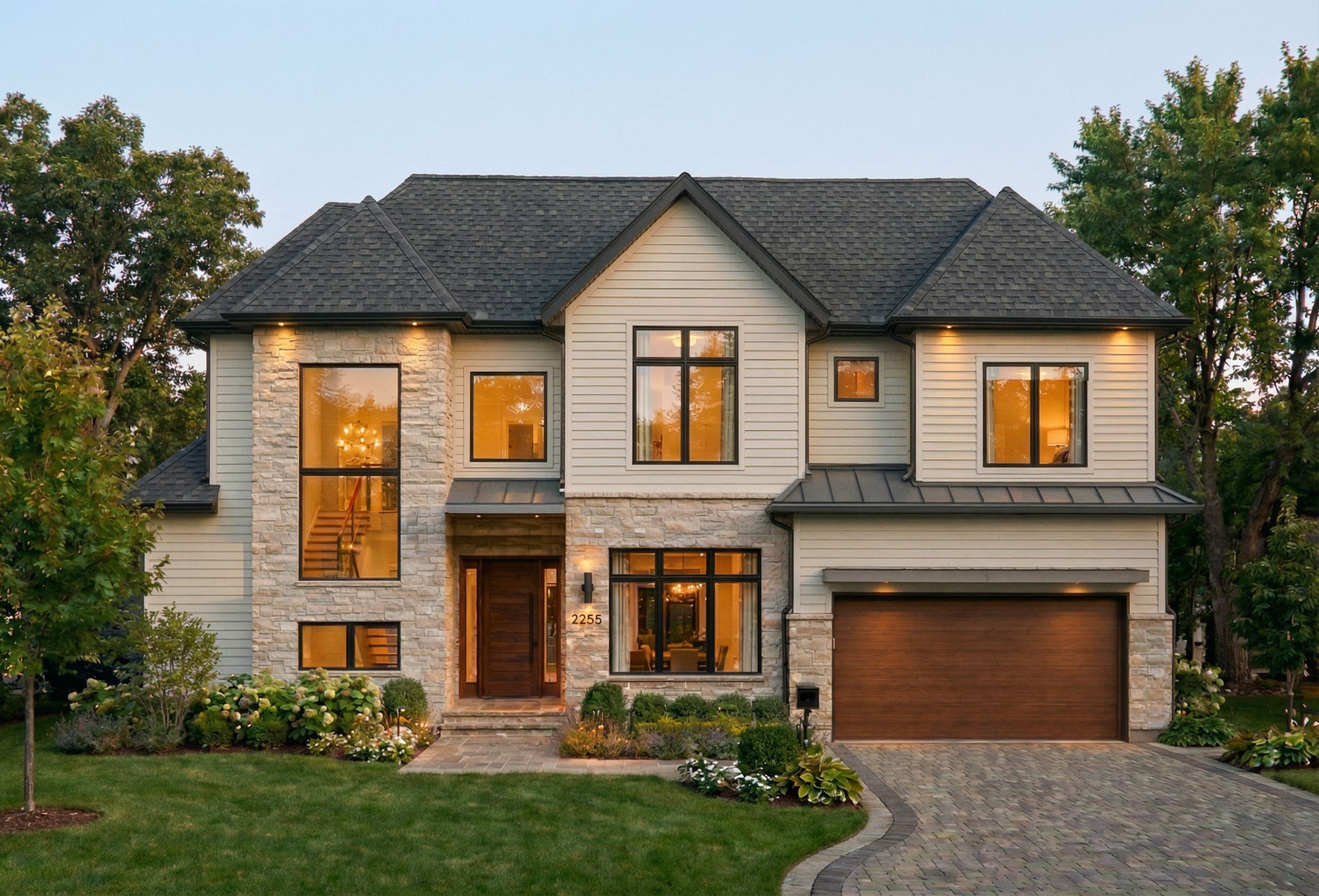 PromptPhoto of a contemporary two-story residential home featuring a blend of stone and wood materials. Architectural details include large glass windows offering a modern aesthetic and enhanced natural light. Surrounded by lush greenery and a well-maintained garden, the home sits in a suburban setting with a paved driveway. Soft, warm evening lighting highlights the textures of the exterior while casting gentle shadows. Captured from a frontal angle with a slight upward tilt, emphasizing the roofline and depth of the facade, evoking a welcoming atmosphere., keep exact camera angle