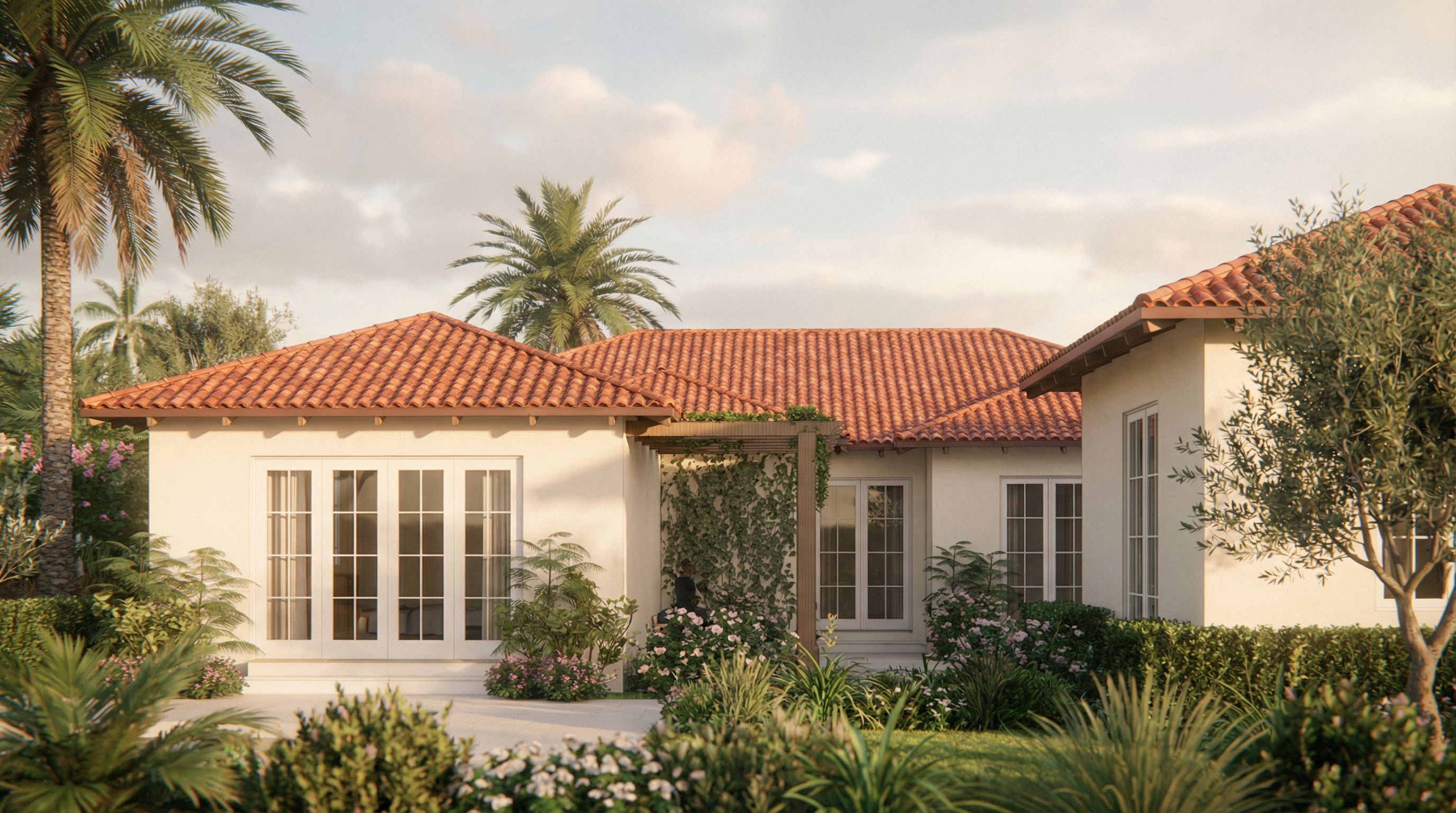 Create me a render of based off of the elevation provided. this is a Mediterranean ranch style home. I want it to be photorealistic and dreamy. the main body of the house is a white stucco. the doors and window frames are white aluminum. the roof is a barrel tile roof see reference photos for depths and massing as well as material and color placement. , keep exact camera angle