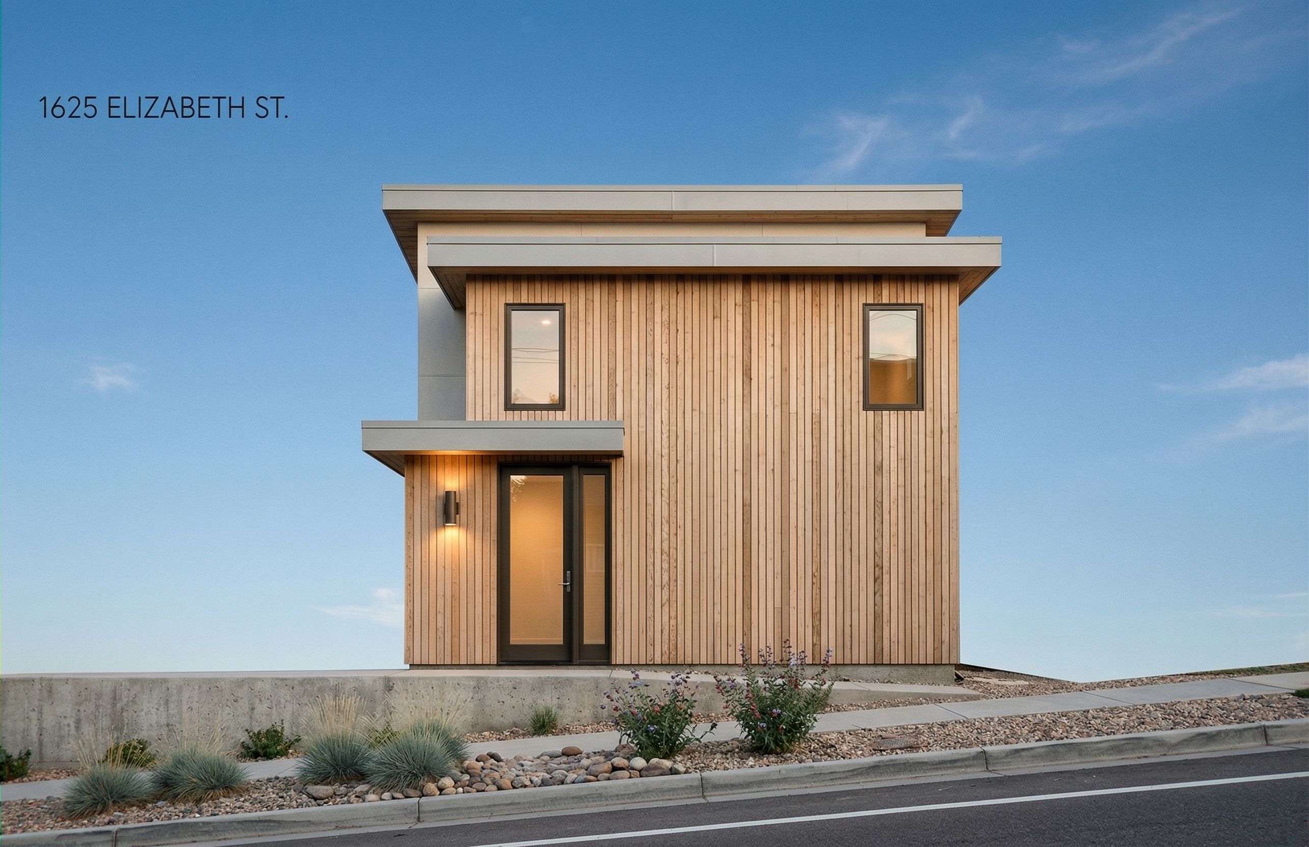 This will be a 2-dimensional render of an ADU. This ADU will be in Denver Colorado on a slightly sloped street. keep the elevation the same as in the image. do not add or change the windows, door, or roof. Place minimal landscaping at the front., keep exact camera angle