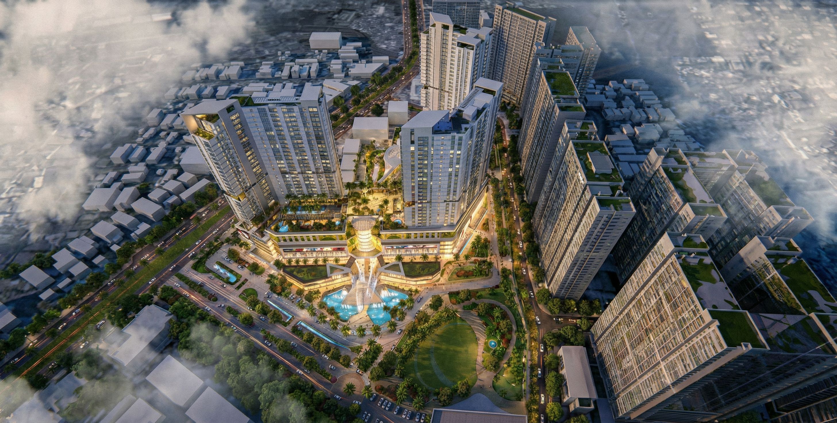 PromptUse uploaded photo to create image of a high-rise mixed-use development, showcasing sleek glass facades and dynamic geometric forms. Architectural details include lush green terraces and a central landscaped plaza with water features. The urban setting features surrounding buildings and a bustling street lined with greenery. Soft, natural daylight casts gentle shadows, enhancing textures. Captured from a bird's-eye view with a wide-angle lens, emphasizing the scale of the development within its environment., keep exact camera angle