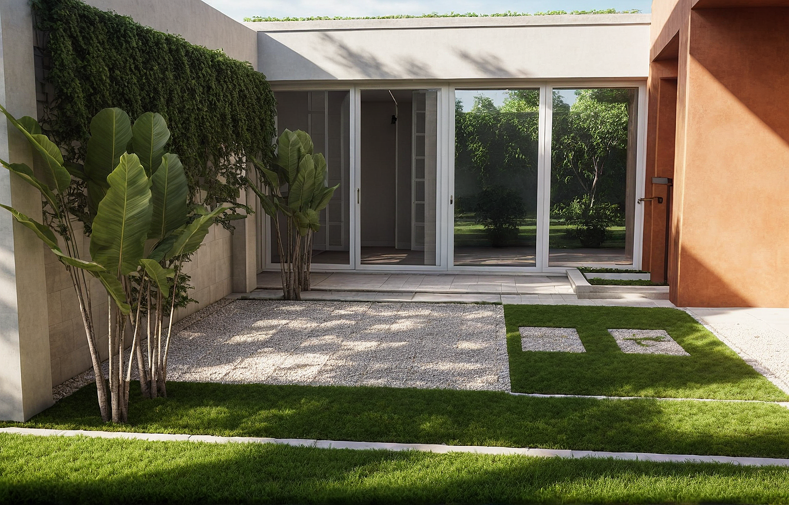 PromptLush american garden. with trees, plant bushes. Hanging leaves on the limestone back panel. Decorate with terracota pots and vases