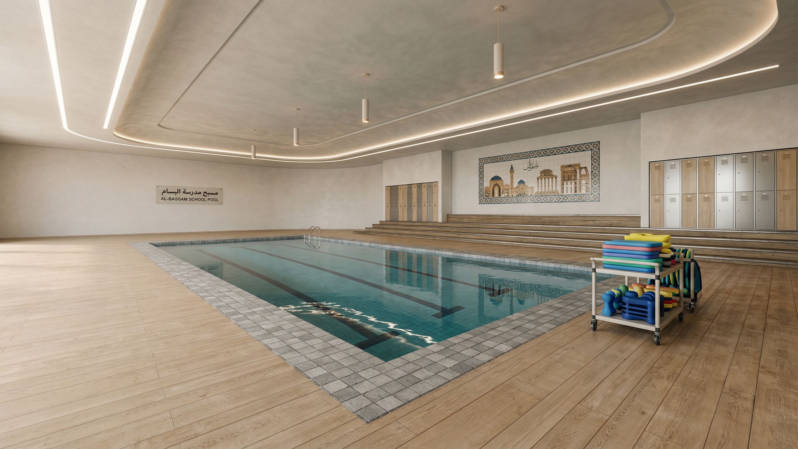 this is a scene of a educational swimming pool in syrian high school for student .. do simple interior and enhance the materials and make it super realistic and add swimming learning equiomwnts add closets and make the pool larger, keep exact camera angle