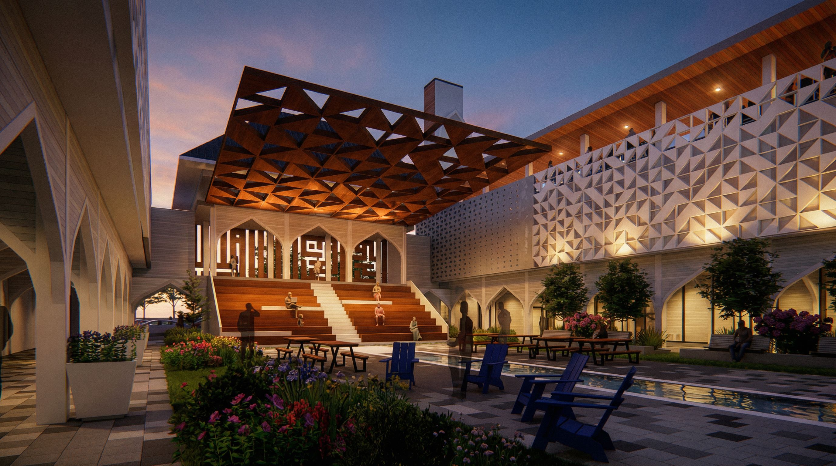 Photo of a contemporary courtyard with a striking pavilion featuring a geometric wooden canopy, surrounded by elegant landscaping and modern seating arrangements. The textured facade showcases intricate patterns, harmonizing with lush greenery. Morning sunlight filters through the canopy, casting dynamic shadows on the stone pathway. From a low angle perspective, focus on the interplay of light and shadow, capturing reflections in the tranquil water feature, framed with vibrant flowers., keep exact camera angle