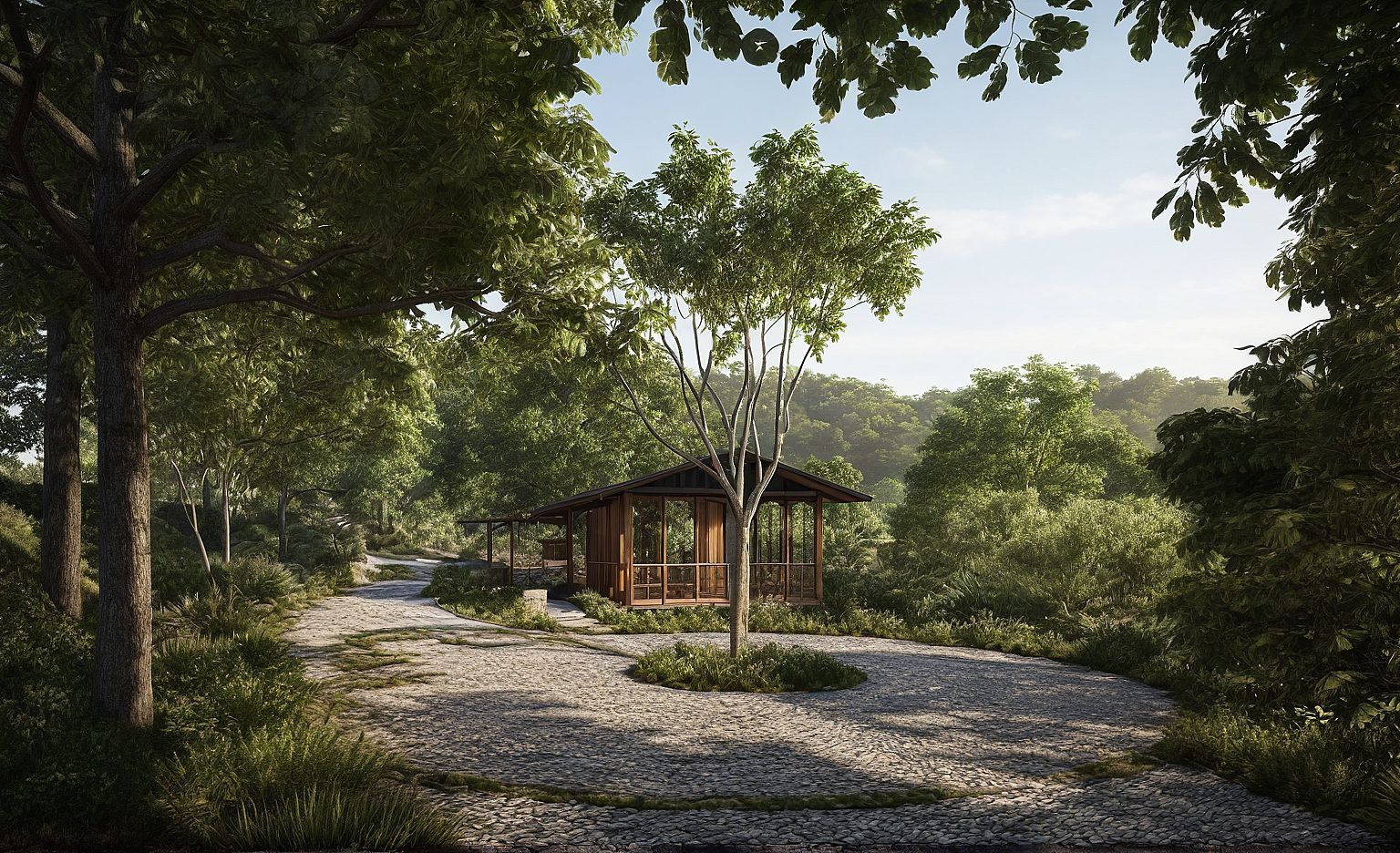 Generate a hyper-realistic morning render of a resort arrival pavilion viewed from a curved cobblestone path. Preserve the architectural design, detailing, materials, and finishes exactly as shown. The landscape should feel intentional and well-maintained: lush with orderly planting along the path edges, soft grasses, and a mix of native and decorative foliage. Trees should retain their current density, placement, and species. Light should evoke a calm, welcoming morning atmosphere with long shadows, soft ambient glow, and subtle light filtering through the canopy. Avoid dramatic effects or overly wild vegetation—focus instead on clarity, realism, and visual warmth that invites the viewer in.