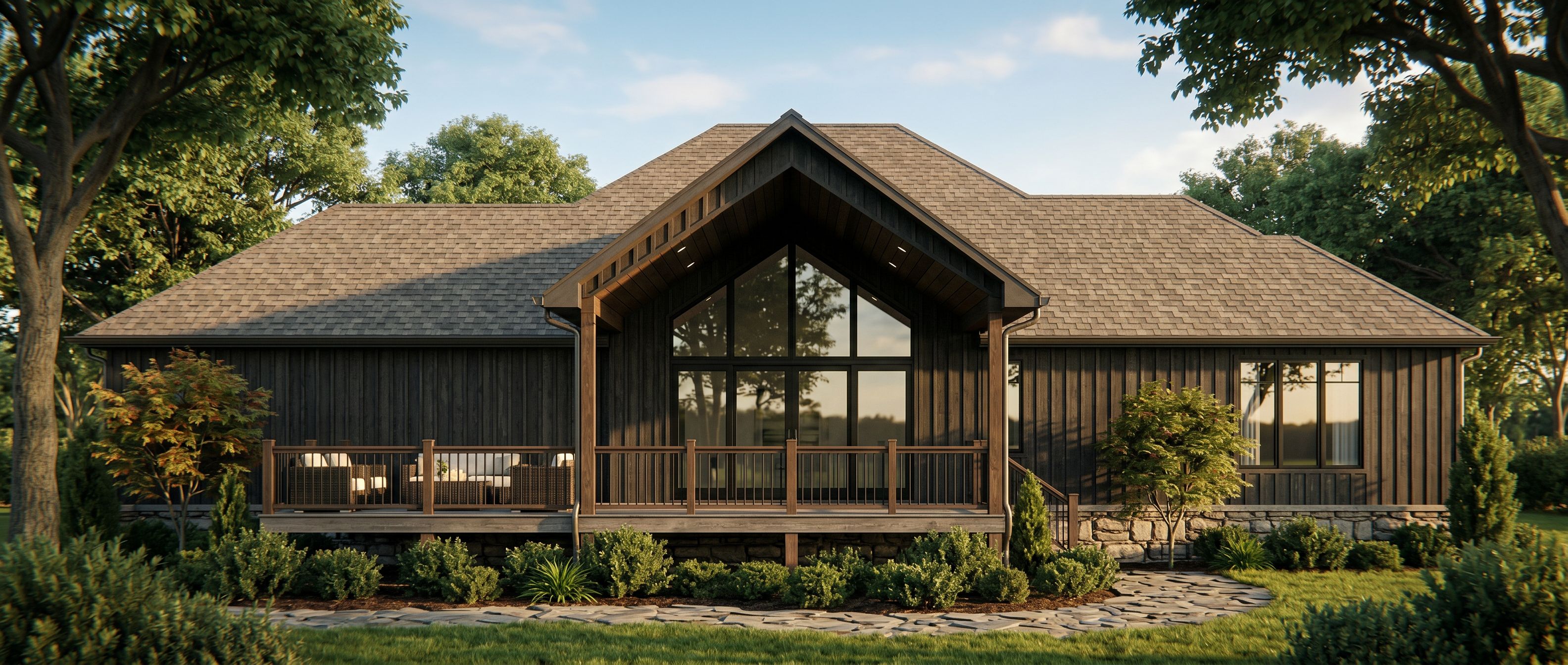 PromptA photo of a modern rear deck area, the center is covered with a large black door thats trinagle in shape, the left side of the deck is a sun deck, only show windows on the right rear side as show, the reference image attached is the front of this home, match all the elements to this render, show landscaping and plants infront of the deck, show deck furniture, black vertical siding, shingle roof, the middle section is a covered deck, show railings and black spindles, keep exact camera angle