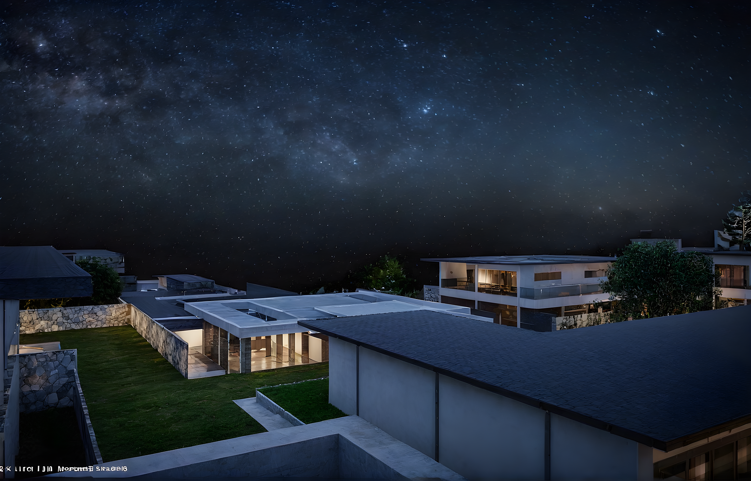 Promptdark sky surround by star there are tree at the back ground every house have warm light the time around 00:00 am focus on rendering star on the sky as background there are very much star every window of the house have very shine warm light on
