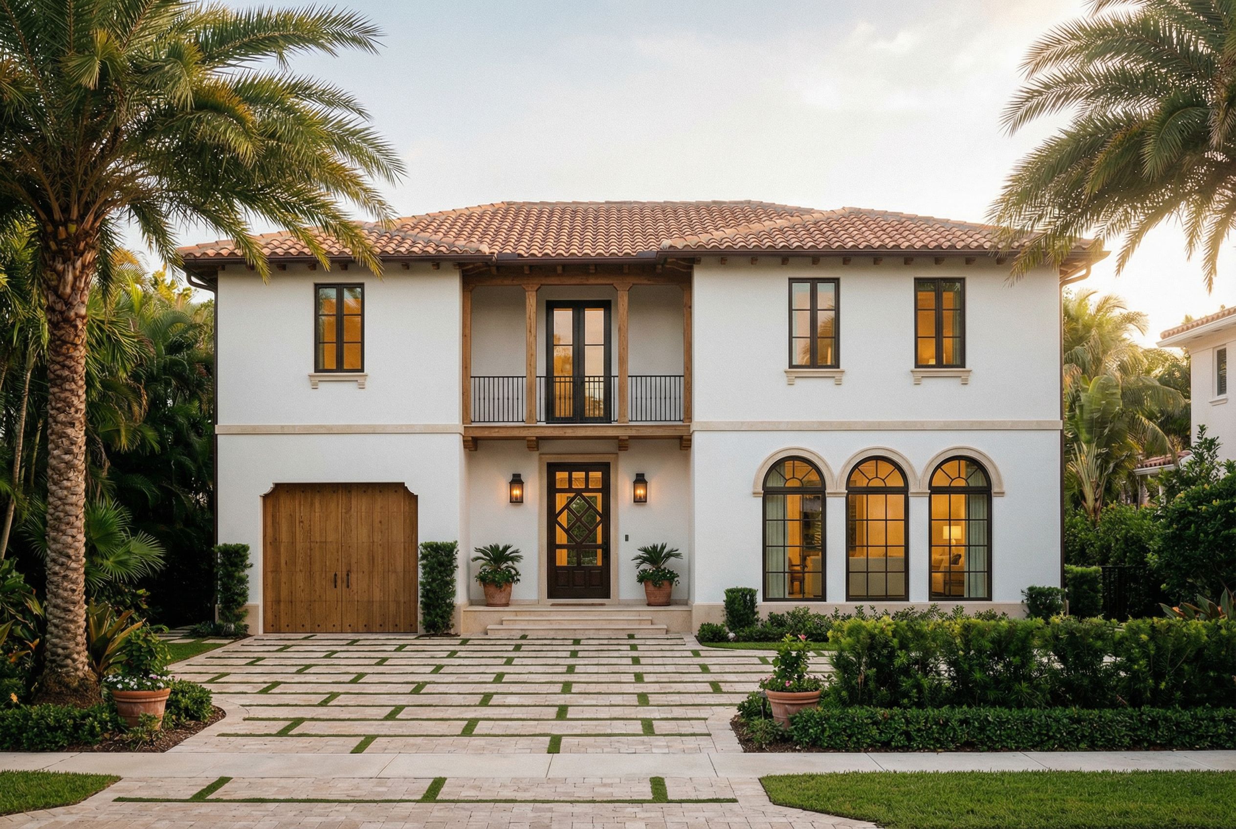 i want a photo realistic, cinematic, dreamy rendering based off of the provided elevation. this is a Spanish colonial style house in palm beach. the window frames and front door are going to be a dark bronze color. the front door has glass panels. keep all of the architectural elements from the elevation. the main body of the house is going to be a white smooth stucco. the elements that are solid grey are going to be beige cast stone. the balcony railing is going to be wrought iron. the roof is going to be a barrel tile roof. the wooden elements like the garage door the balcony columns, the beams and rafter tails are going to be pecky cypress. refer massing in the first reference image. refers to the other two images as material and color inspo, keep exact camera angle