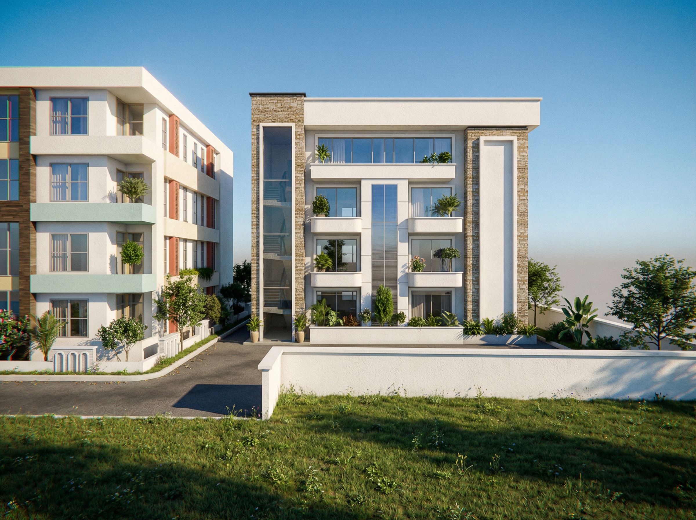 Promptmodern residential apartment in an urban residential housing,natural vegetation,lighting,clear resolution,white paint on walls and clear stone where is put, keep exact camera angle