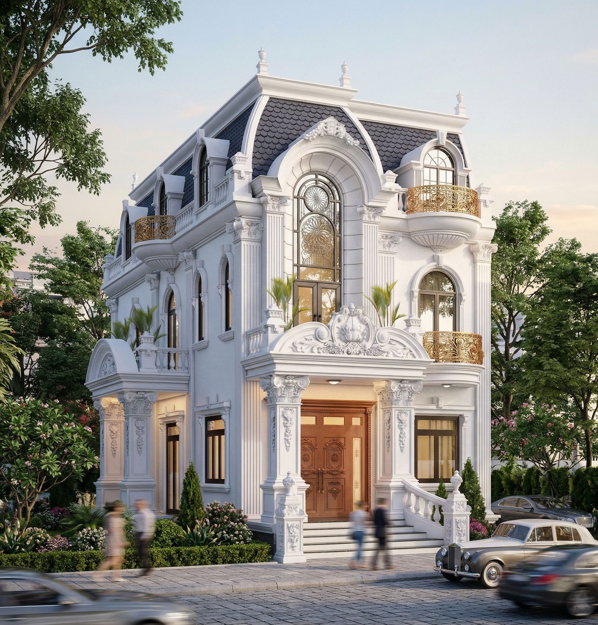 PromptPhoto of an elegant villa featuring intricate classical design elements, including ornate columns and gilded balconies. Set in a lush, green urban landscape, surrounded by trees and subtle garden landscaping. Soft natural lighting at dawn casts gentle shadows, enhancing the textures of the white facade and detailed roofing. Captured from a three-quarter view with a slight upward angle, using a wide-angle lens to emphasize the grandeur and character of the architecture., keep exact camera angle