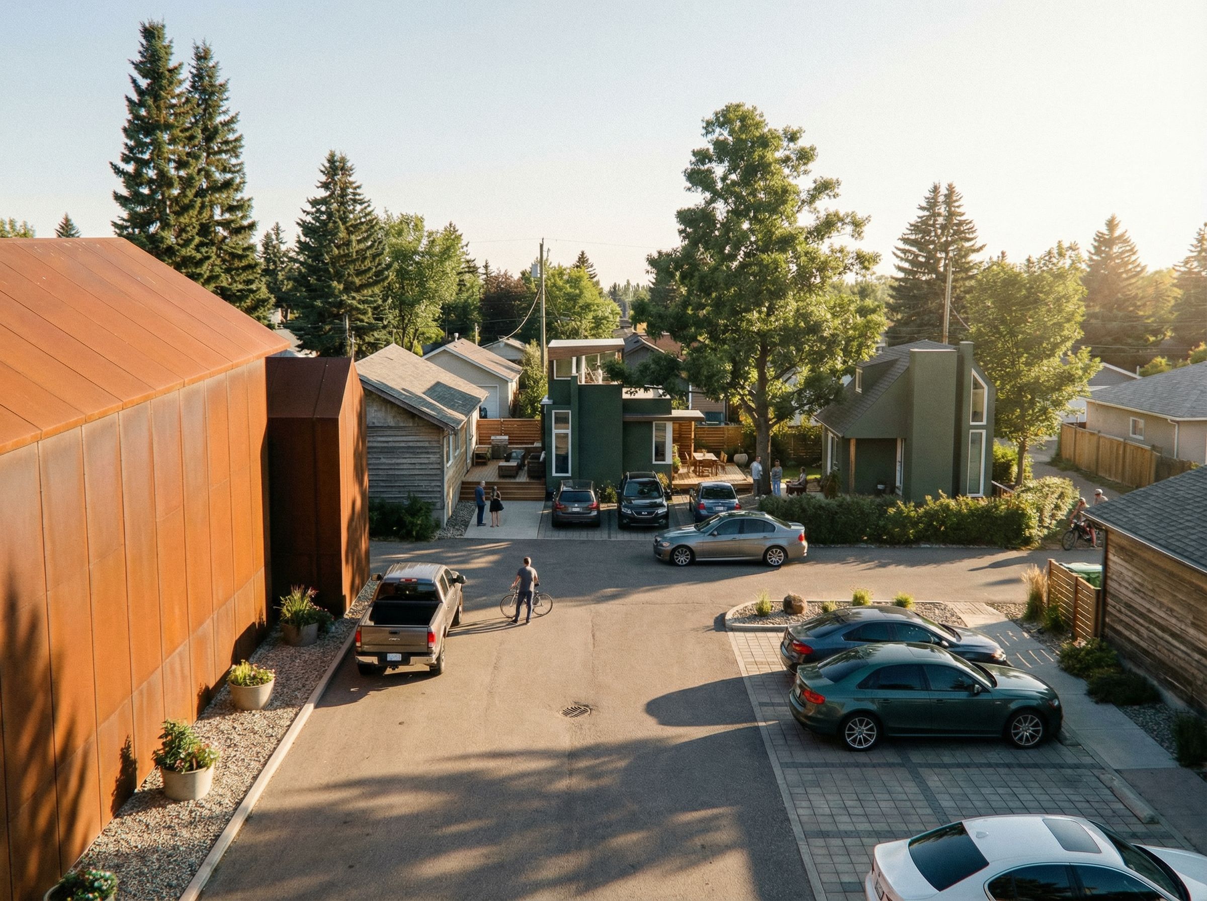 Promptmodern, parking in courtyard, smooth rusted steel vertical walls, dark green stucco walls, white window frames with trees and single storey low bungalows parallel in background with back lane, keep exact camera angle, keep exact camera angle