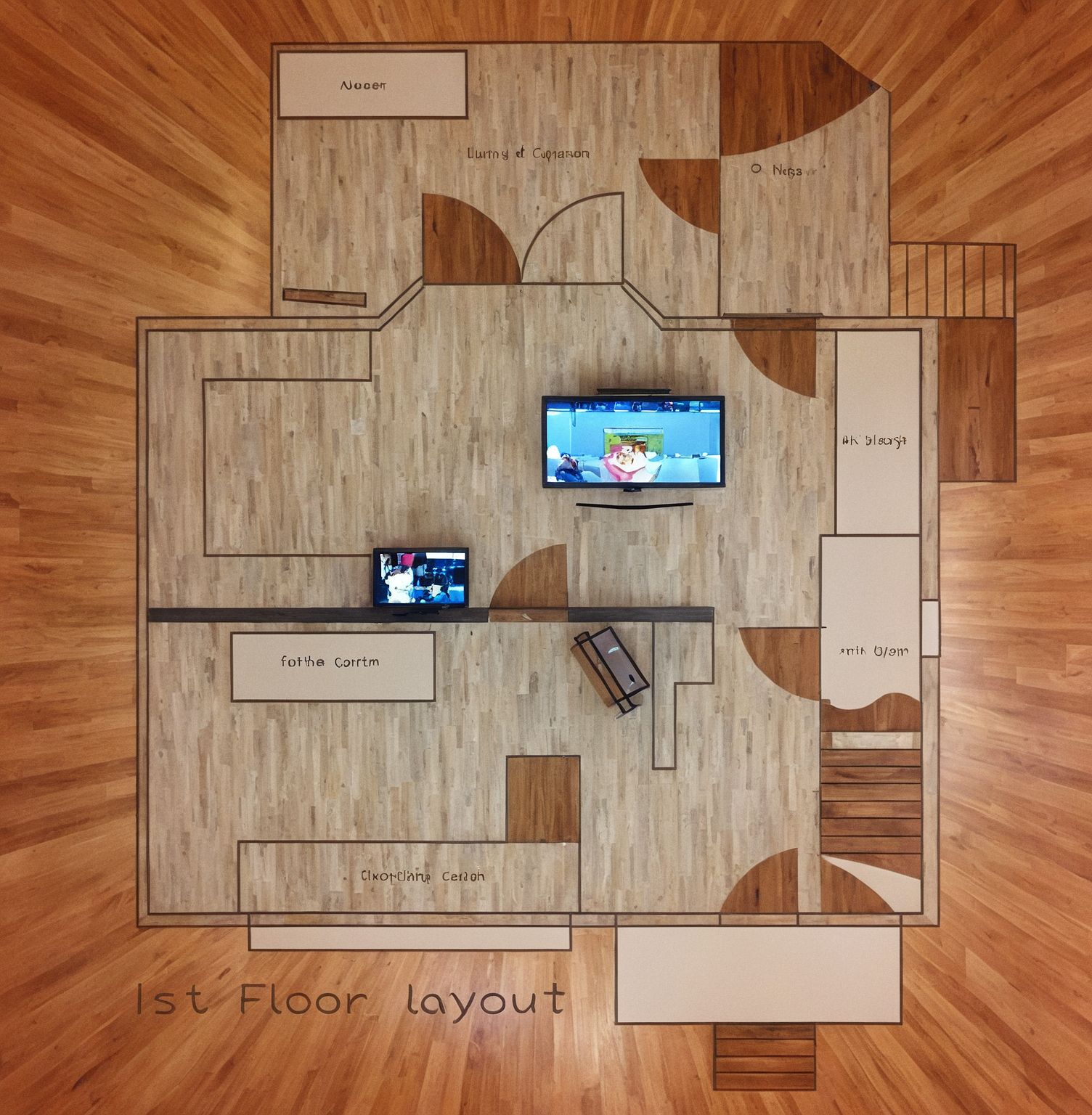 PromptFloor plan of a modern residential home interior, showcasing an open layout with living and dining areas, highlighting furniture placements like couches and a TV. Emphasize clean lines and functional spaces with a focus on natural light streaming through large windows, creating soft shadows. Urban setting with nearby structures depicting a cozy neighborhood vibe. Utilize a slight overhead camera angle for spatial clarity and depth, simulating a wide-angle lens to capture the entirety of the layout and furnishings.