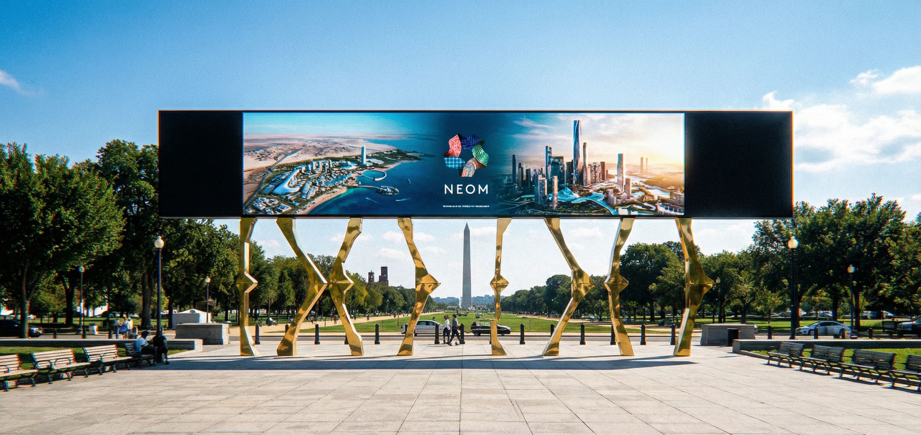 Prompt keep exact camera angle , BLACK IS SCREEN , YELLOW IS GOLD CLADDING , , Washington DC , PUT NEOM PROJECT ON SCREEN, keep exact camera angle