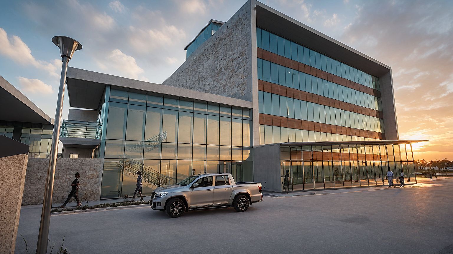 Promptsunset, warm, seats, modern hospital, entourage, concrete stone, clear glass, metal panel