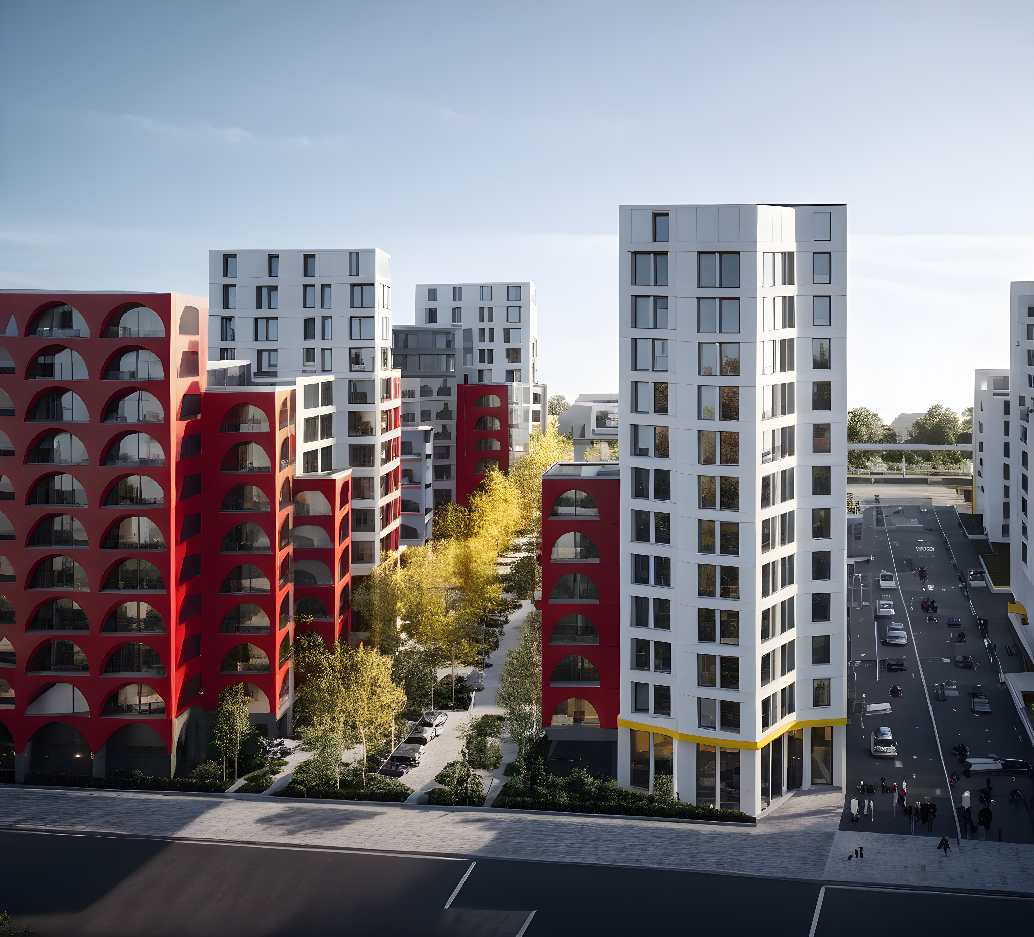 PromptMODERN ARCHITECTURE, DAY LIGHT, STREETS, RED COLOR, YELLOW COLOR, GREY COLOR AND WHITE COLOR
