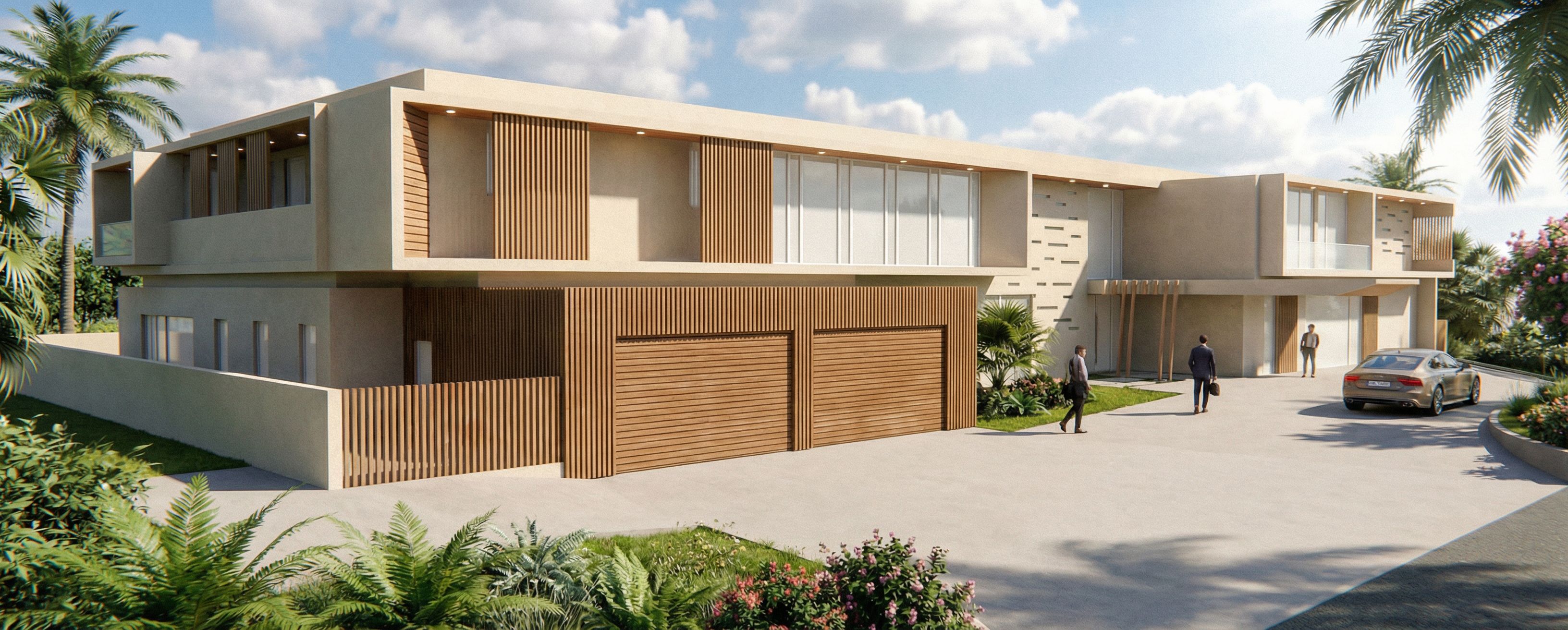 PromptEN EL SEGUNDO PISO SOBRE EL PORTON DEL GARAGE CAMBIAR LOS VIDRIOS Y MARCOS POR UN COLOR BLANCO OPACO. SACAR LAS PUERTAS DEL GARAGE AL MISMO NIVEL NIVEL DE LA FACHADA. CONSERVANDO LA MADERA EN UN TONO MAS OSCURO Y SEMI BRILLANTE. GIRAR EL VEHICULO 90 GRADOS Y MOVERLO BIEN HACIA LA DERECHA., keep exact camera angle