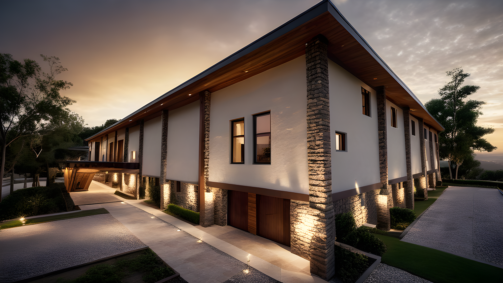 PromptThe building has a stucco exterior with brown-colored stone columns and brown double doors. The ground floor is made of stone, and the roof is made of wood.