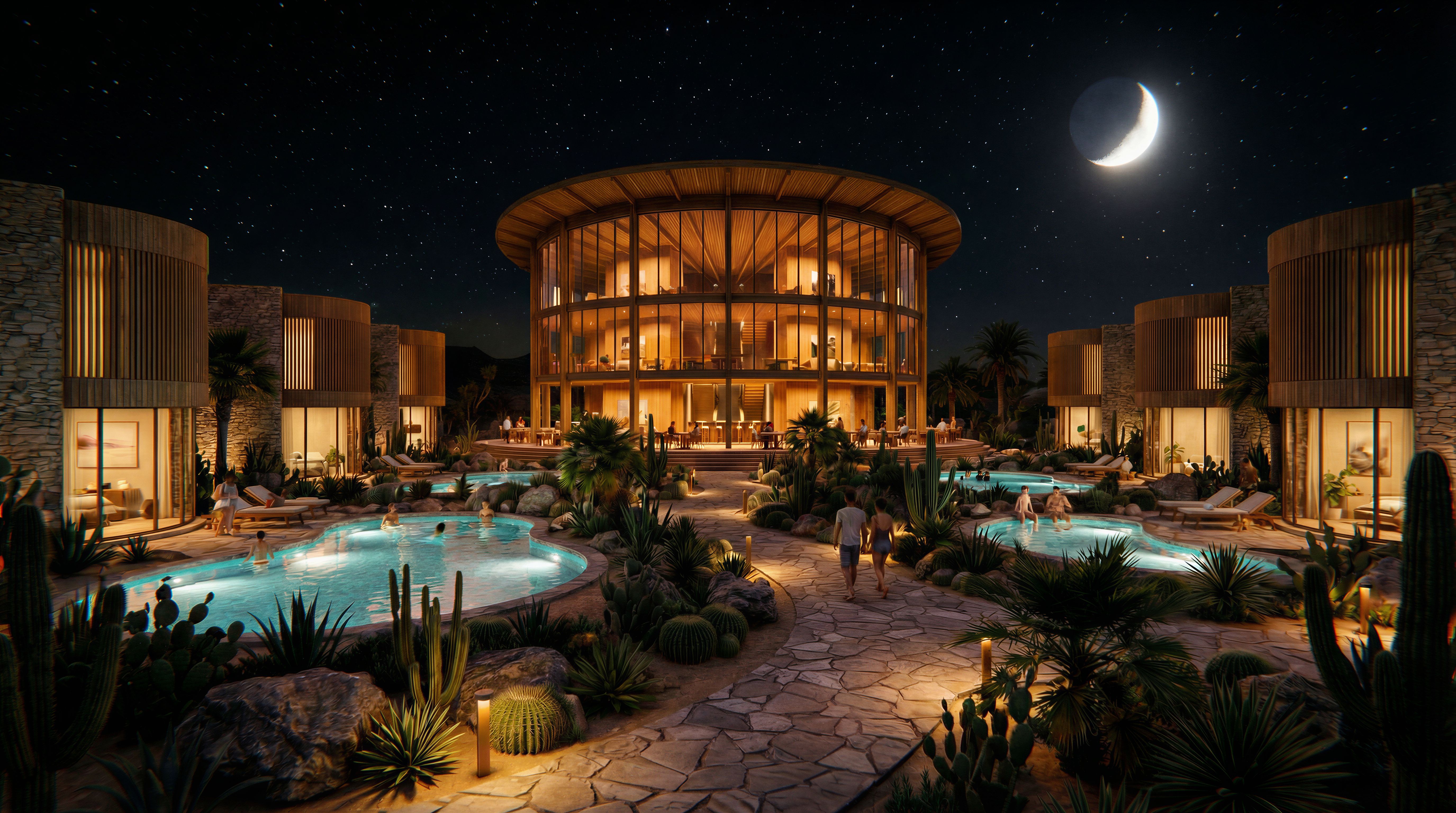 Depict at night with dark black sky with stars and a crescent moon, light entire site including pools with soft 2700k lights, keep exact camera angle