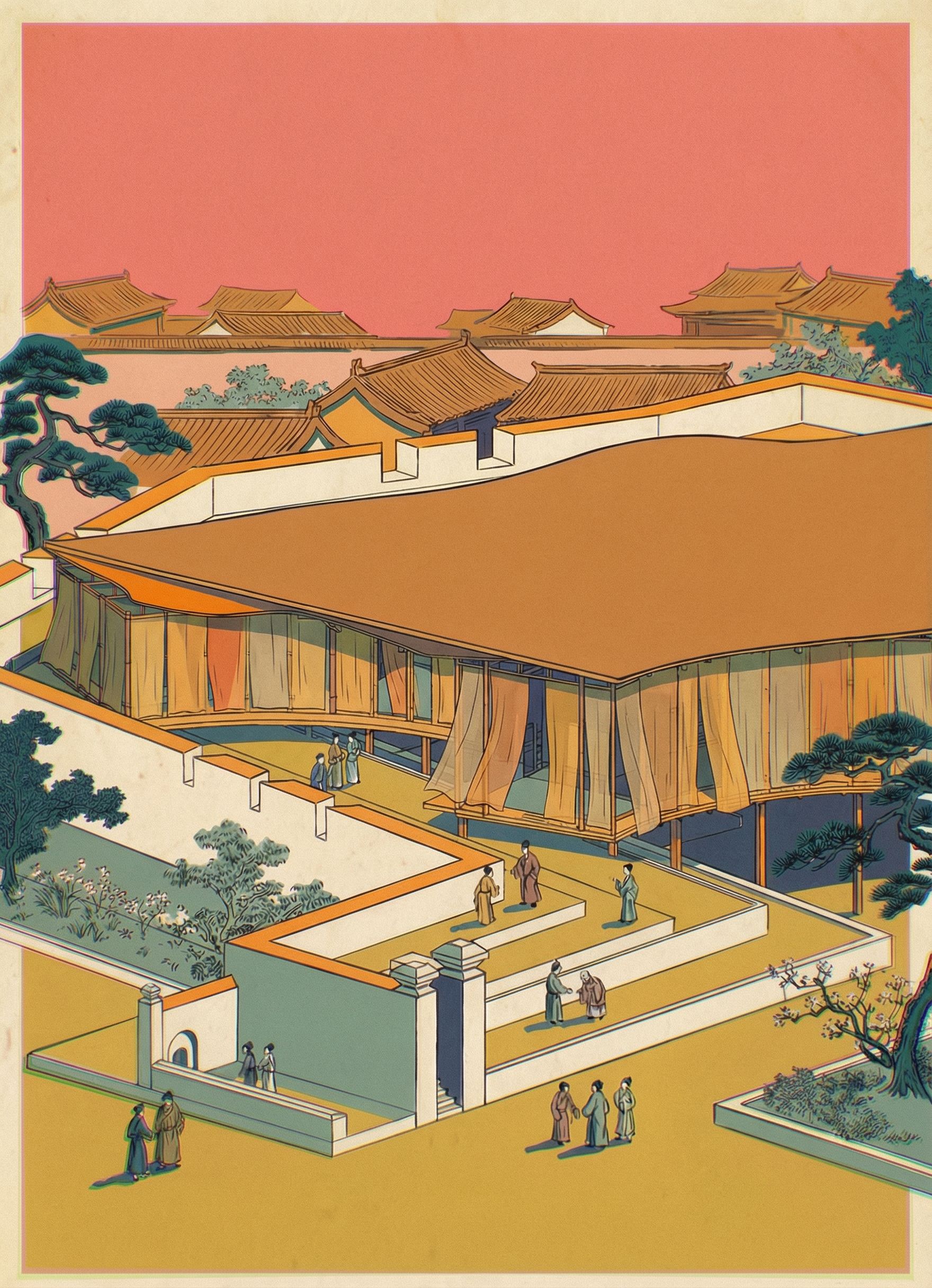 Keep the structure, roof, terraces, and overall geometry unchanged, only transforming the wall surfaces into flowing fabric screens. The result should feel light, breathable, and contemplative, emphasizing openness and layered spatial boundaries., keep exact camera angle