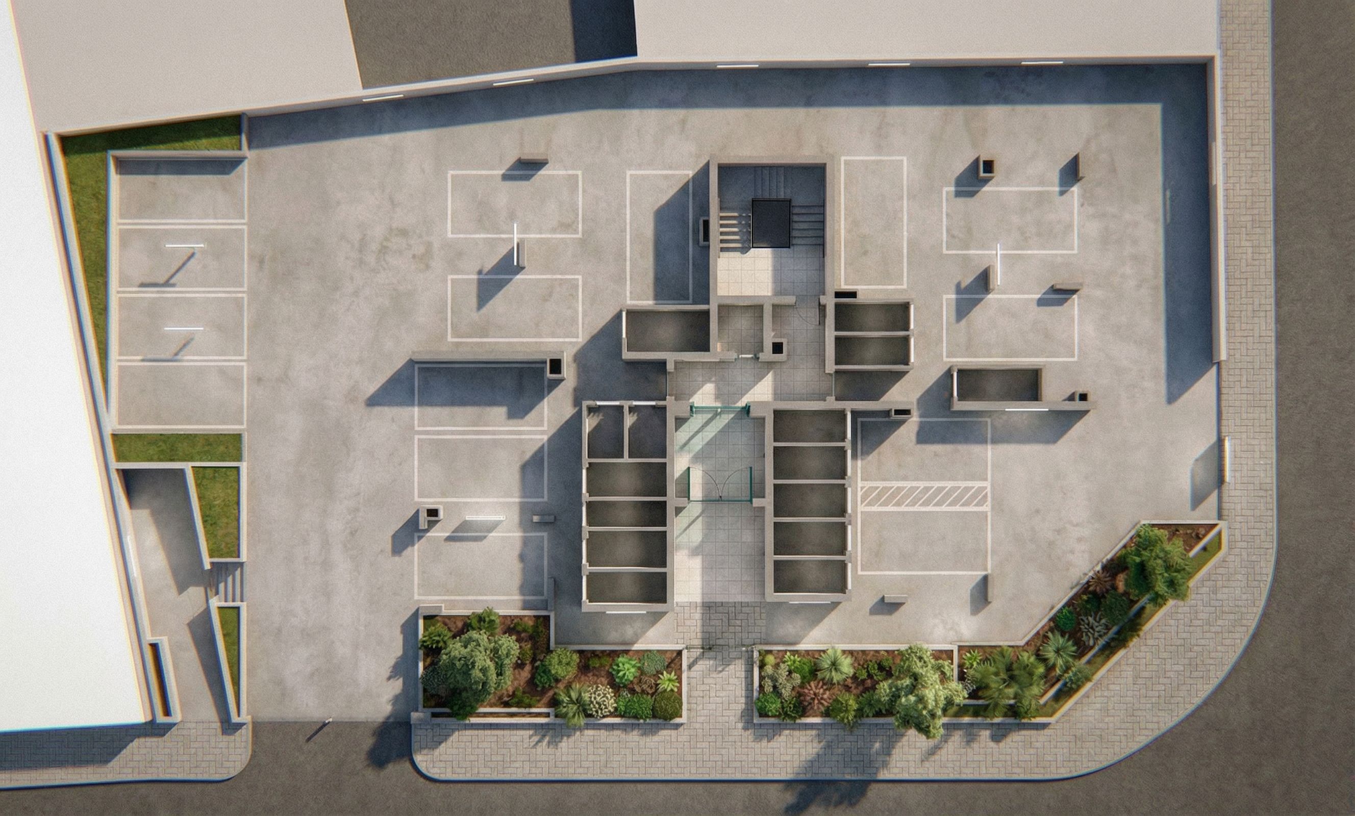 PromptRemove all architectural lines, dimensions and text, keep exact camera angle this is a ground floor parking area with storage units, lobby area and pedestrian paveway. Put garden only where is green in the plan - nowhere else. Do not put any furniture do not put anything in the storage units do not put any gates near the parking spots. no lights, keep exact camera angle