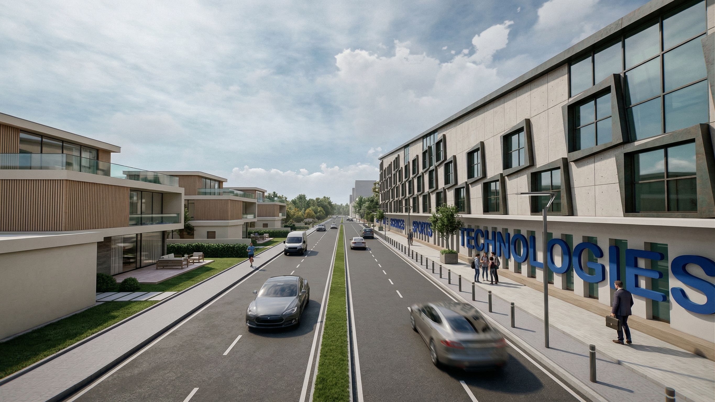 PromptPhoto of a modern technology building, featuring a sleek façade with a mix of glass and textured concrete. Emphasize the unique window designs and contrasting materials. Set within an urban environment, roads lined with greenery, and minimalistic adjacent structures. Capture soft, diffused natural lighting during an overcast afternoon, creating gentle highlights on surfaces. Perspective from eye level along the street, utilizing a wide-angle lens to encompass the surrounding area, enhancing depth and scale of the building within its context.
