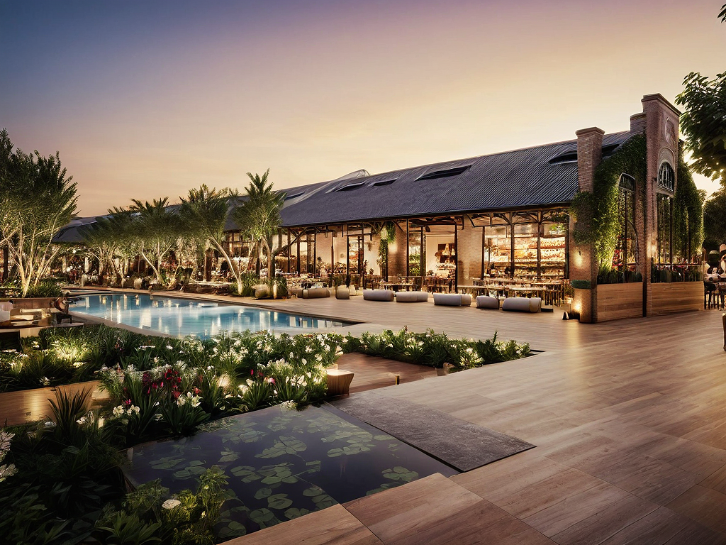 food hall, amazing garden, same construction materials, same facade, amazing terrace, sunset