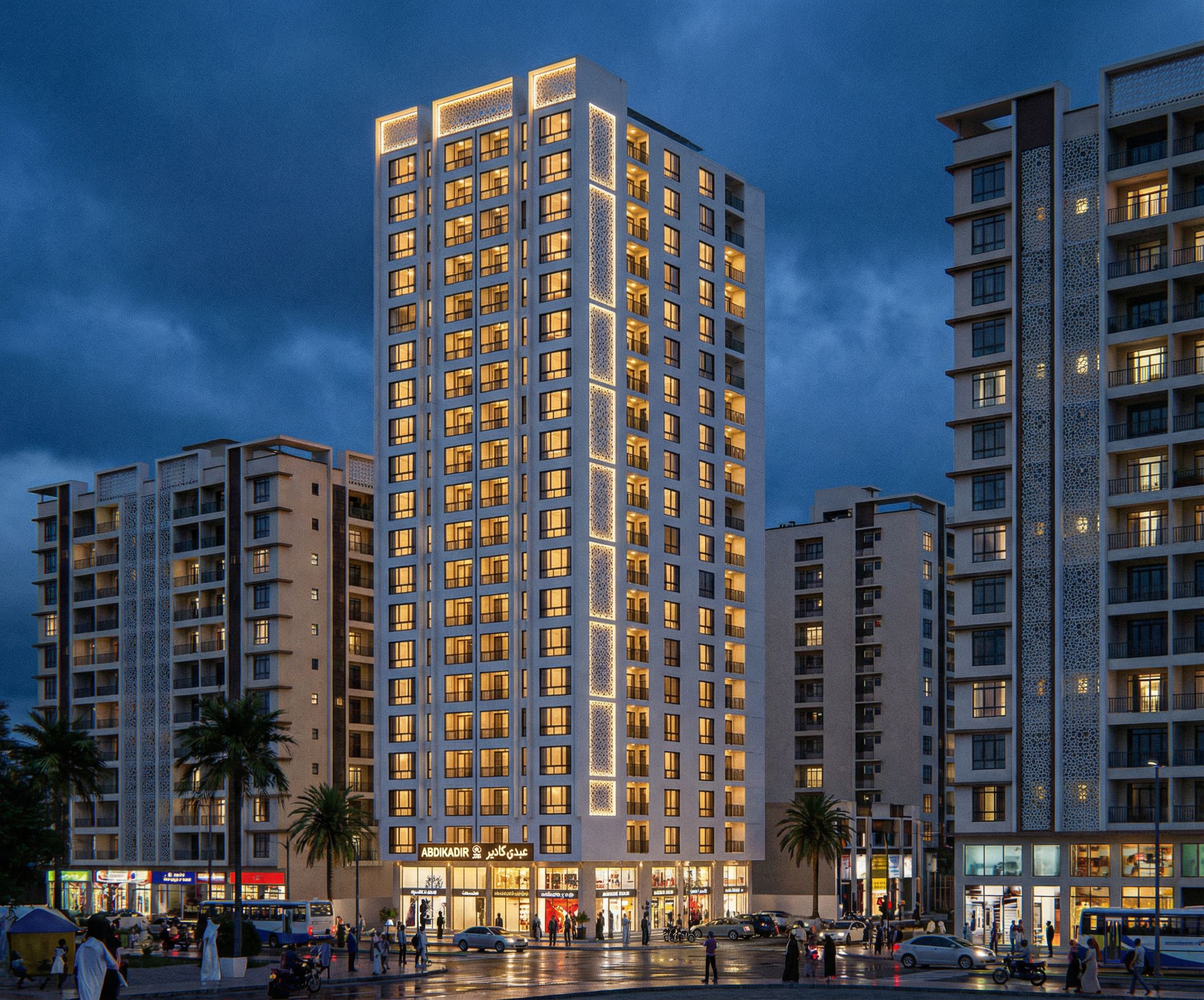 A RESIDENTIAL DEVELOPMENT IN EASTLEIGH NAIROBI WITH GROUND FLOOR AS COMMERCIAL AND 20 STORIES APARTMENT COMPLEX. MAKE GLASS CLEAR , REFLECTIVE AND REALISTIC. TURN ON THE LIGHTS IN THE BUILDING. USE WHITE WALL MASTER ON THE BUILDING. MAKE THE BUILDING TO HAVE A CONTEMPORARY ARABIC CONCEPT. WRITE THE NAMES "ABDIKADIR TOWER JB" ON THE BUILDING. INCLUDE PEOPLE OF SOMALI AND AFRICAN ORIGIN IN THE IMAGE. SHOW WHOLE BUILDING. SHOW BUILDING FROM BOTTOM TO TOP AND PUT IT BETWEEN TWO OTHER BUILDINGS. MAINTAIN ORIGINAL CAMERA ANGLE AND PUT BUILDING IN A COMMERCIAL RESIDENTIAL AREA. MAKE IMAGE HIGH RESOLUTION., keep exact camera angle