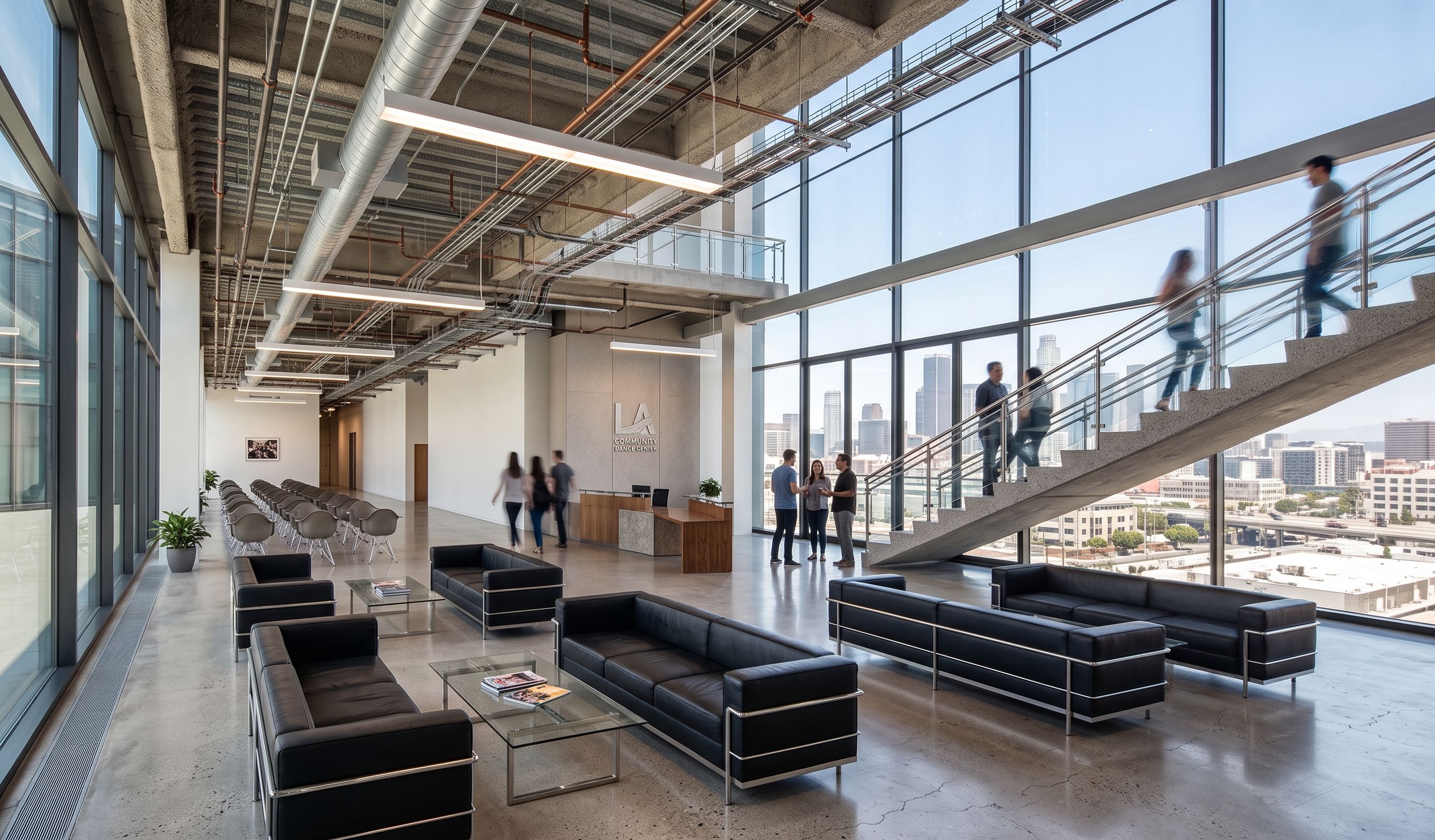Create a modern lobby area for a community dnace center. keep everything the same. showcase the structural system and have an exposed ceiling showing the mechanical system. have a background view of downtown los angeles and the