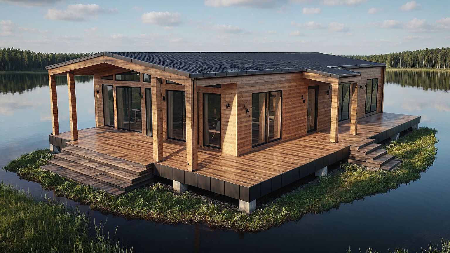 PromptA modern barnhouse with wooden planks. A forest and a lake in background.