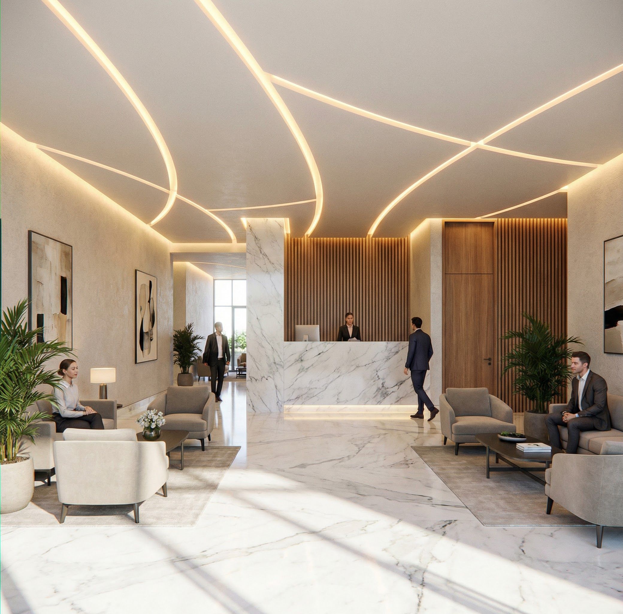 PromptEntrance lobby, in the central part with marble reception bar and white Carrara marble floor, indirect perimeter lighting, indirect ceiling lighting in the curved lines, comfortable waiting chairs, minimalist atmosphere, respecting the sample image where the ceiling is shown