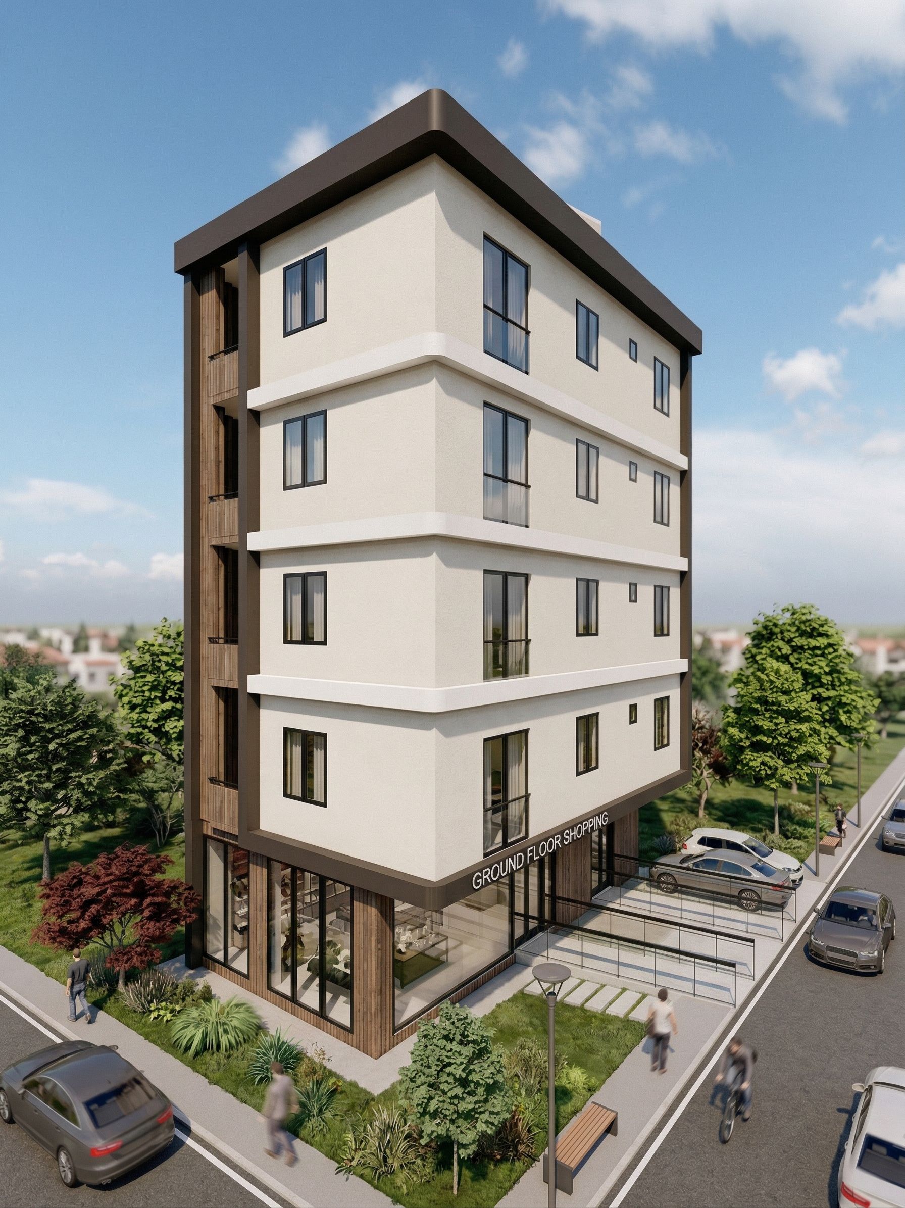 Photorealistic exterior render of a modern apartment building,Realistic daylight, V-Ray style, high detail, glass reflections, stone and plaster facade, realistic shadows,GROUND FLOOR SHOPPİNG, keep exact camera angle
