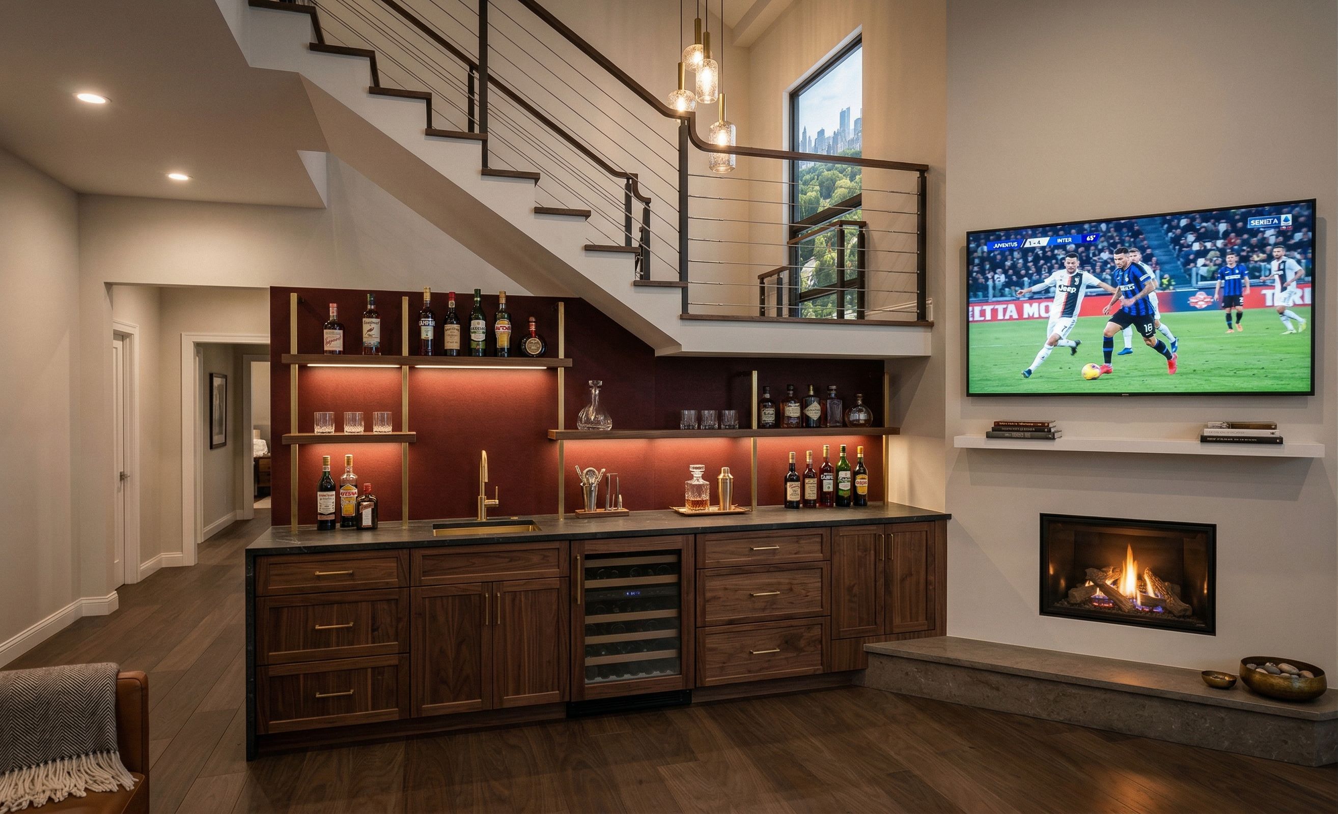 Promptmake photorealistic rendering from this image add wet bar under the stairs next to fireplace as indicated by red area, design it so the fireplace and wet bar are connected fireplace is direct vent gas fireplace, show fireplace on burning TV above the fireplace is playing Italian soccer game lights on in the room add light fixtures where appropriate , keep exact camera angle