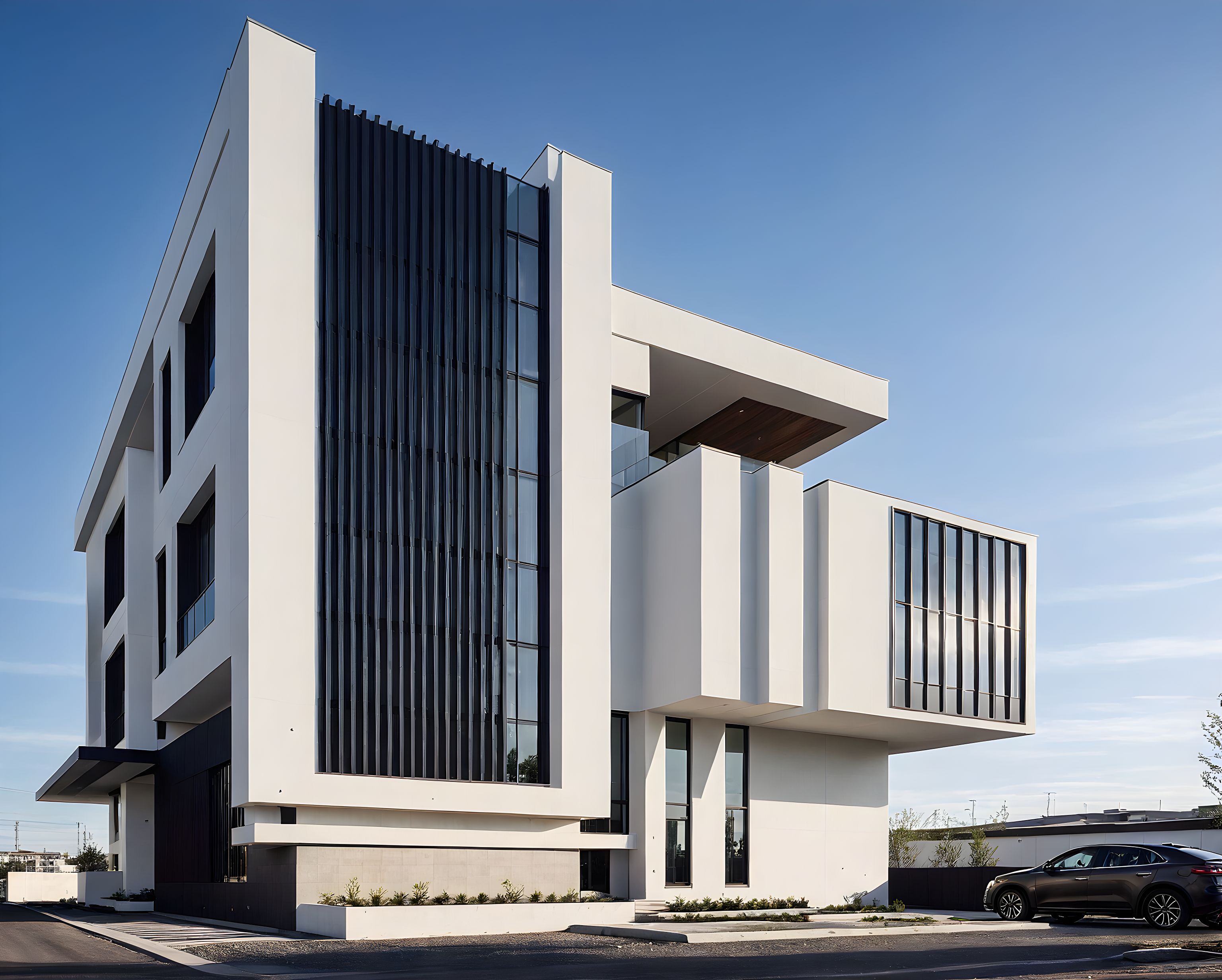 PromptPhoto of a modern residential building with a prominent geometric design, featuring clean lines and a combination of white and black textures. Architectural elements include expansive curtain glazing, vertical slats for visual interest, and cantilevered sections. The urban setting includes a landscaped front area, with a stylish car parked nearby. The scene is set during the day, with bright natural light casting soft shadows across the façade. Captured from a low angle perspective, the framing emphasizes the structure's height and unique architectural contours, showcasing lifelike qualities of materials and surroundings.