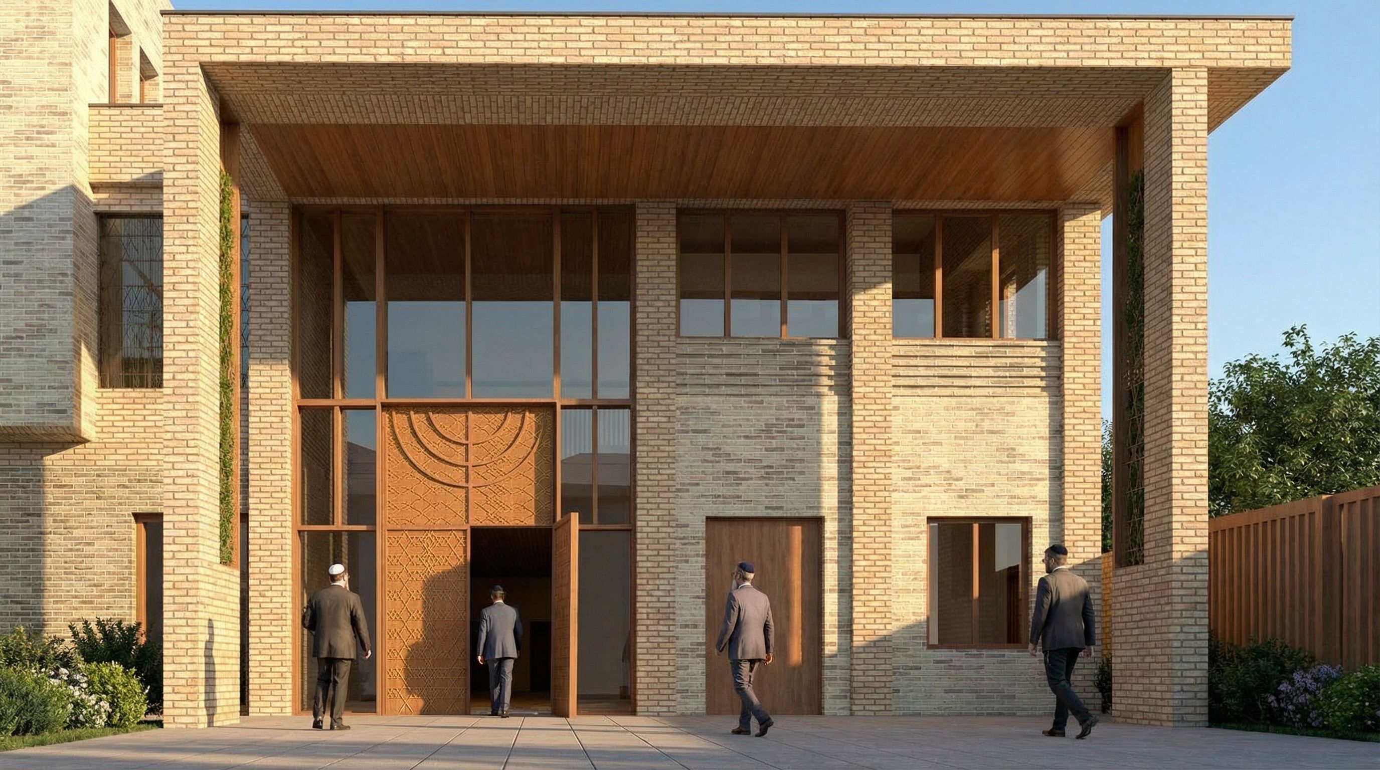 architectural exterior rendering, render this 3D mass into photorealistic rendering, Photo of a modern synagogue building featuring a blend of textured brick and warm wood accents. Emphasize the intricate facade details, including large windows that enhance natural lighting, and a striking patterned entrance door. morning sunlight casts soft shadows, highlighting the architectural lines. keep Perspective, men with kippa, eye level view, including people, high quality, professional, detailed scene