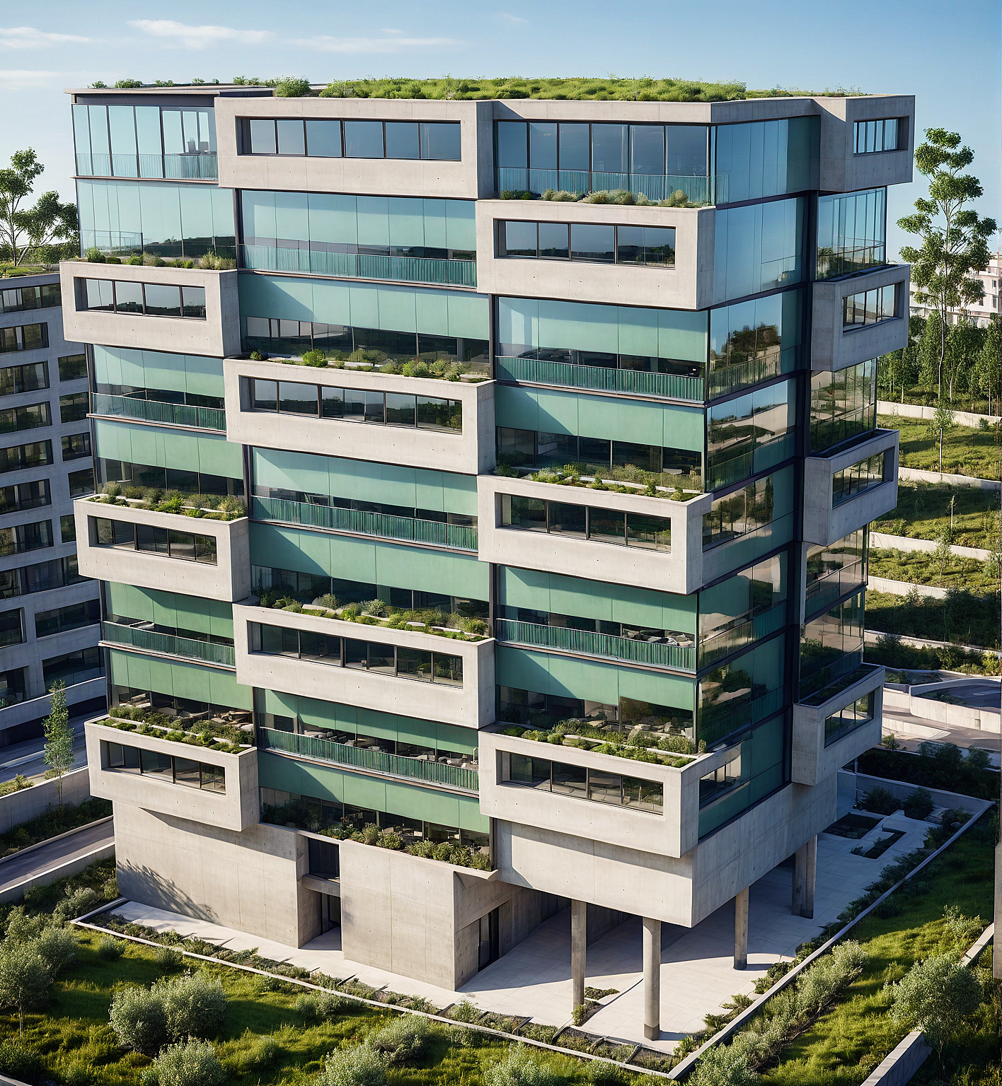 Promptmodern architecture, luxury apartament, landscape, large glass window, concrete facade, green roof, balcony, entrance to underground parking