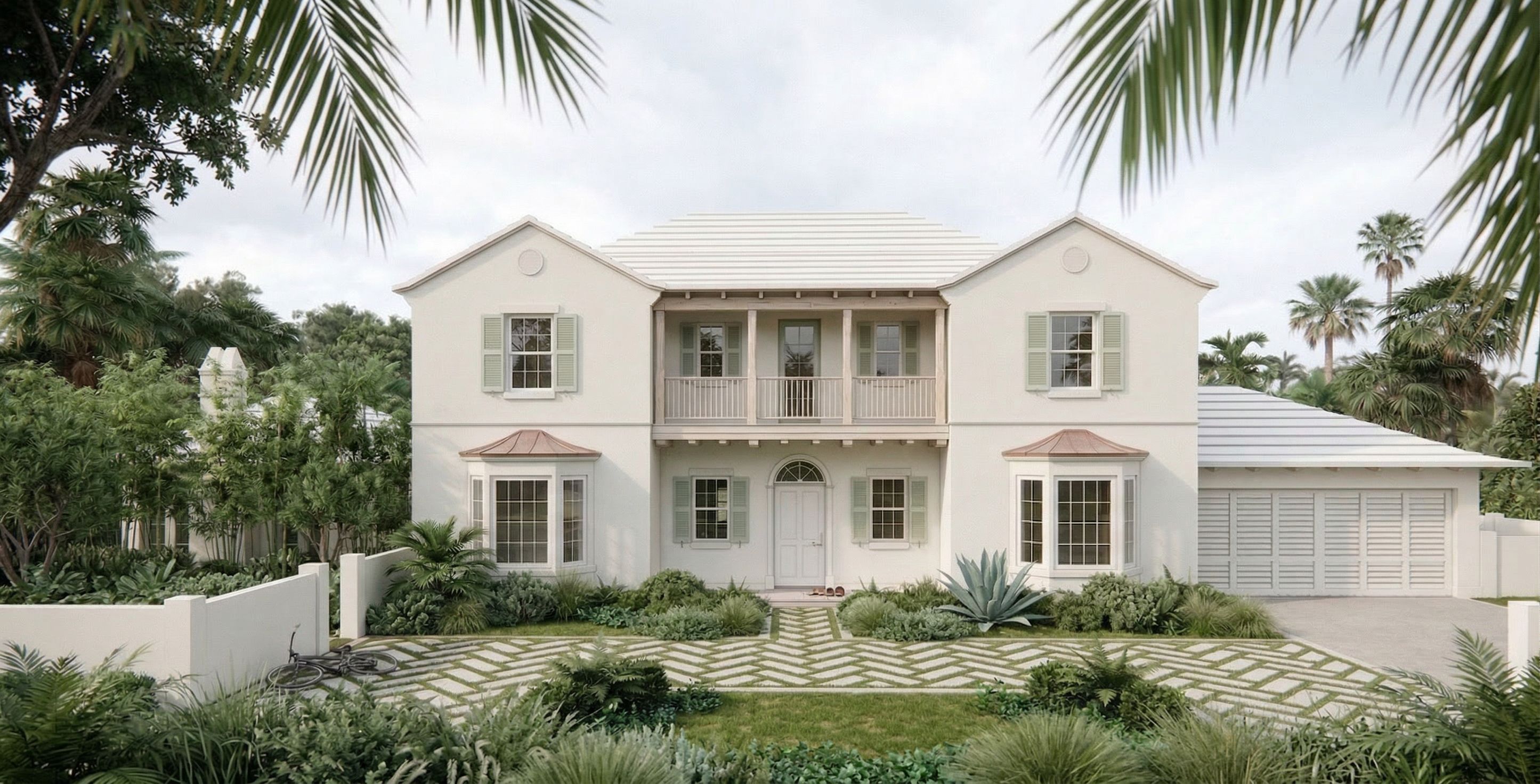 Ultra-photorealistic architectural “money shot” render enhancement of the provided image. Do NOT change the architecture, massing, proportions, openings, materials, colors, roof, windows, doors, or camera view in any way. Keep everything exactly the same. Do NOT alter any hardscape driveway, walkways, paving pattern, or layout must remain identical. ONLY enhance and redesign the landscaping. Planting bed locations may be adjusted or expanded, but must feel soft, natural, and integrated with the existing hardscape — avoid rigid or overly geometric shapes. Create a high-end Palm Beach landscape design with a soft, organic, and effortless feel: Loose, flowing planting bed edges never sharp or overly defined Layer planting naturally: Low groundcovers slightly spilling over edges Soft, full shrubs with varied heights Occasional airy or sculptural tropical plants palms, ferns, grasses Avoid symmetry — composition should feel balanced but not formal Privacy + depth: Add layered hedging behind the site wall Hedge should be semi-transparent and varied in height Partially obscure the cabana/structure behind while still allowing glimpses through Avoid flat, clipped hedge walls — keep it soft and dimensional Money shot composition VERY IMPORTANT: Enhance foreground planting to create depth and framing without blocking the house Subtly guide the eye toward the front door and central axis Add richness and layering from foreground → midground → background Slight atmospheric depth very subtle to separate layers Ensure all surfaces are well lit and clearly visible — no harsh shadows or blown-out highlights Design intent: Frame the entry subtly, not symmetrically Soften the base of the house with fuller planting Let planting gently overlap hardscape edges for a relaxed, lived-in feel Keep all architectural elements fully visible Plant palette feel: Muted, tonal greens only no bright or artificial colors Mixed textures fine, soft, slightly coarse Minimal but intentional focal plants Enhance realism: Natural variation in plant density and height Slight imperfection and asymmetry Soft shadows within planting beds No visible bare soil Lawn should feel slightly richer and natural, not overly perfect. Lighting must remain soft, diffused, and evenly balanced — no golden hour, no harsh contrast — but with enough clarity and brightness to achieve a polished, high-end “money shot” look. Final result should feel like a luxury, editorial-quality architectural photograph — soft, elevated, and expensive — with lush, organic landscaping and layered privacy — while keeping the architecture and hardscape completely untouched., keep exact camera angle