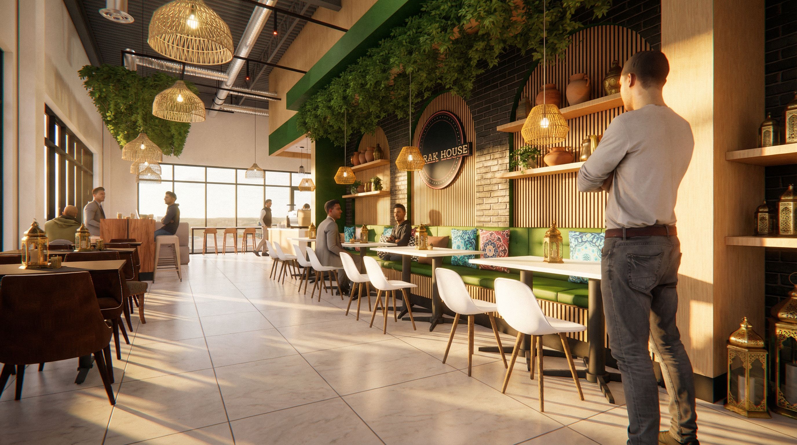 Use the uploaded file to generate an Interior of cafe shop featuring a Middle Eastern theme, warm ambiance, hanging plants above seating, a white countertop, light wood slats, and dark green wall color and charcoal brick on the back of the bar. Modern furniture includes a white table, porcelain tile flooring, and a woven light pendant., keep exact camera angle, super realistic, keep exact camera angle