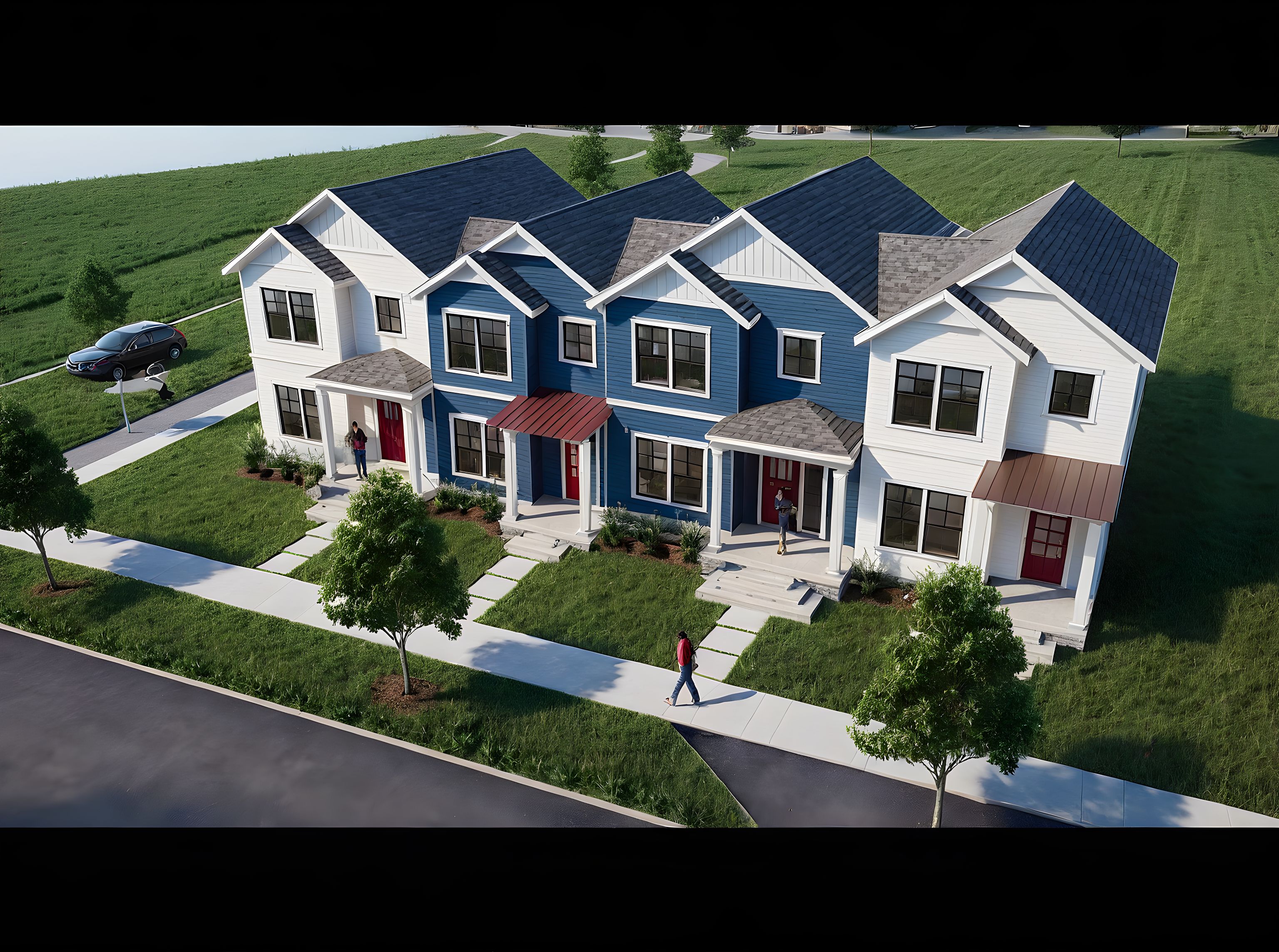 PromptModern style Rowhouses with a homey outside feel. Outer left house : white tones all over; inner left house : blue tones all over; inner right house : upper level both sections brown, lower level with window red, lower level with door brown; outer right house : white tones all over