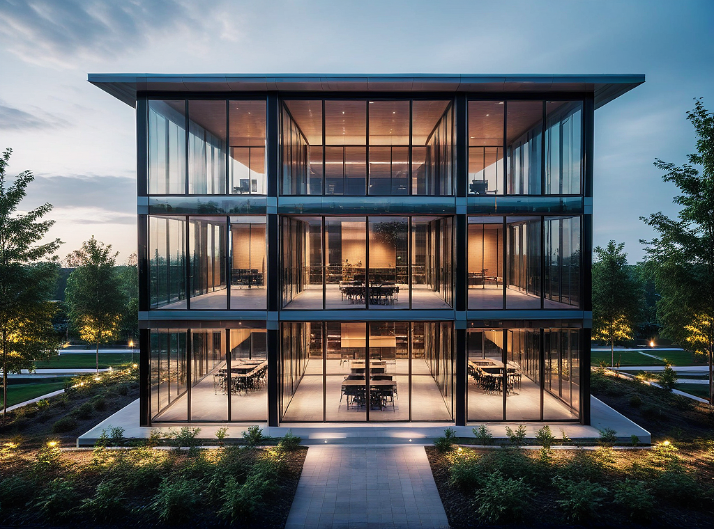 modern office building, glass, elegant, bricks, lights, nature
