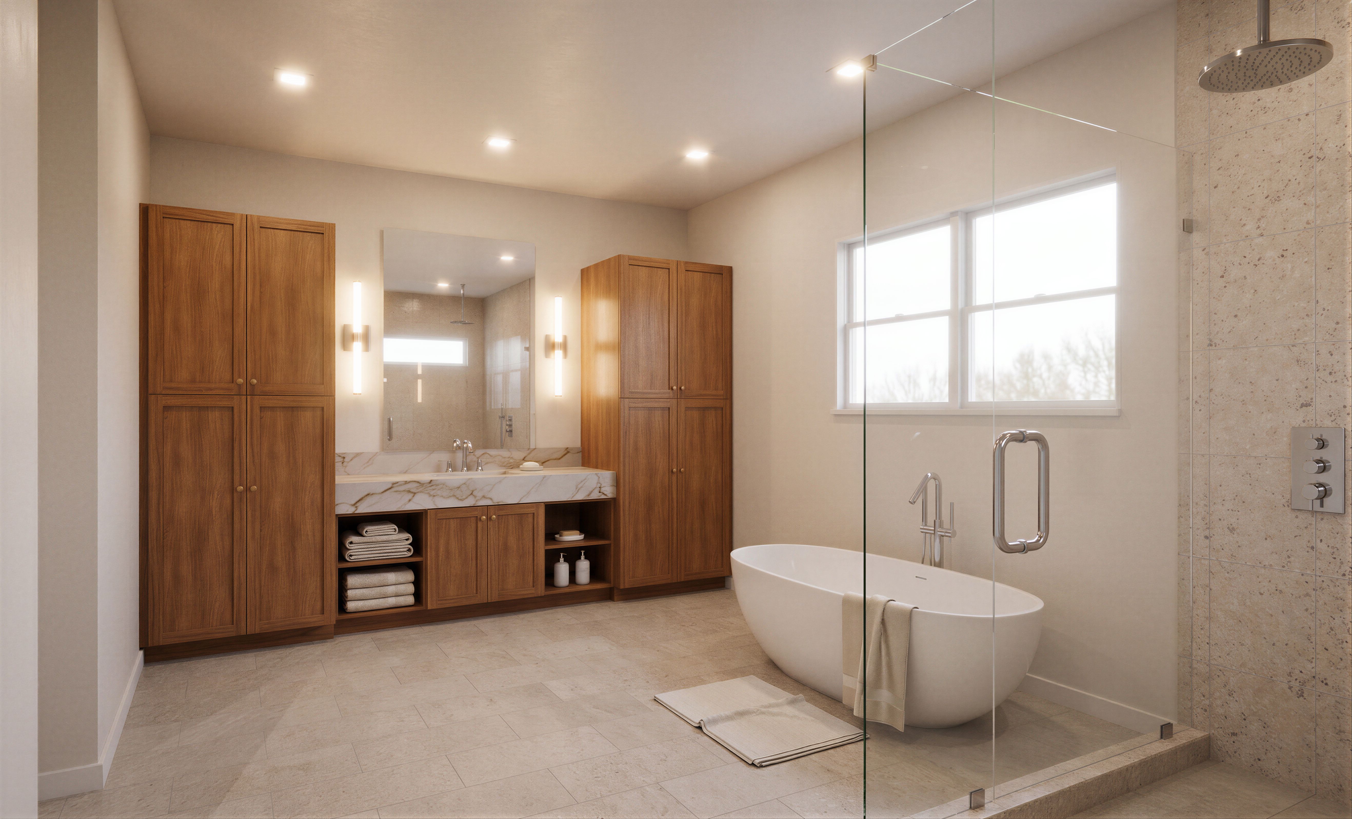 ke photo-realistic renderings of the master bath Add shower hardware and other miscellaneous items where appropriate; Light fixtures are on, bright room; Only skies and top of trees is seeing through the windows, blur and washed out the view slightly; The window reflection on the shower glass is a minimum, keep exact camera angle