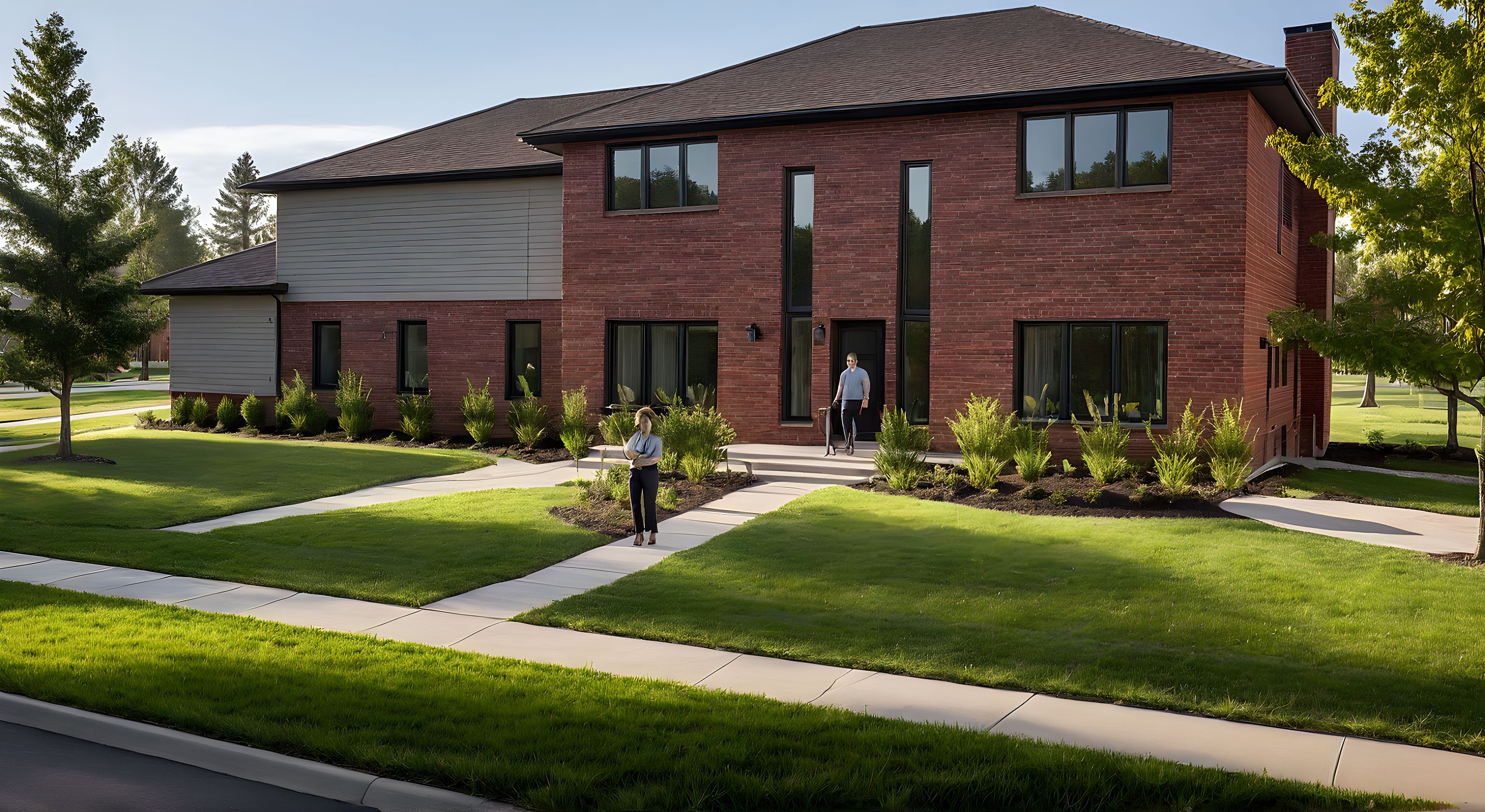 Photo of a modern two-story residential home featuring a combination of brick and siding exterior. Highlight the textured red brick facade, large windows for natural light, and distinctive vertical elements by the entrance. Set in a lush suburban environment with green lawns and mature trees. Emphasize soft, diffused daylight creating gentle shadows, suggesting early afternoon. Capture the scene from a slightly elevated angle using a standard lens to enhance depth and context, showcasing the surrounding landscape while focusing on the building's architectural details.